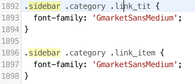 우측 사이드바의 '분류 전체보기'와 '1차 카테고리'의 굵기를 두껍게 하여 '2차 카테고리'와의 구분을 명확하게 하고 싶었다. CSS에 해당 클래스가 없어서 이 부분은 코드를 새로 추가해 주었다. 나중에 찾기 쉽도록 .sidebar를  검색한 후 해당 클래스명이 모여있는 부분에 아래와 같은 코드를 작성했다.
