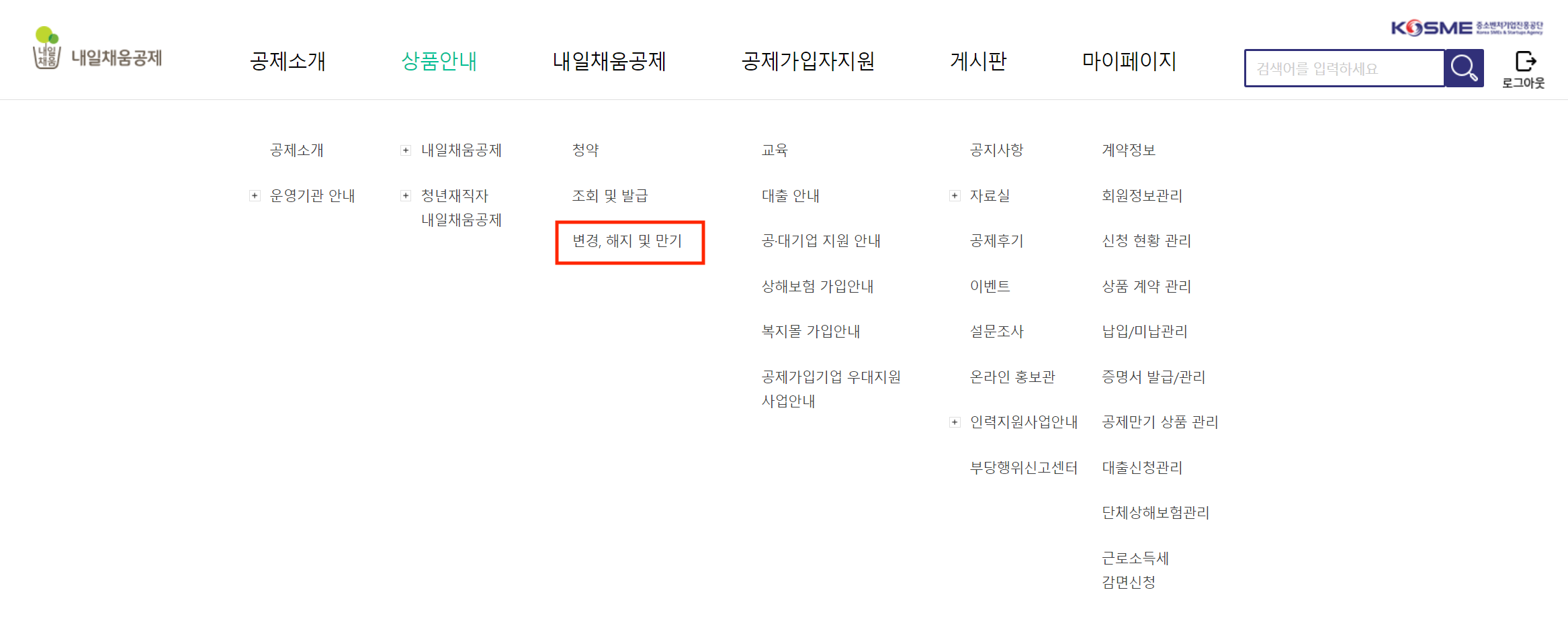 홈페이지 이동 후 공인인증서를 이용하여 로그인을 하고 상단 메뉴바에서 내일채움공제 > 변경, 해지 및 만기 카테고리를 선택한다.