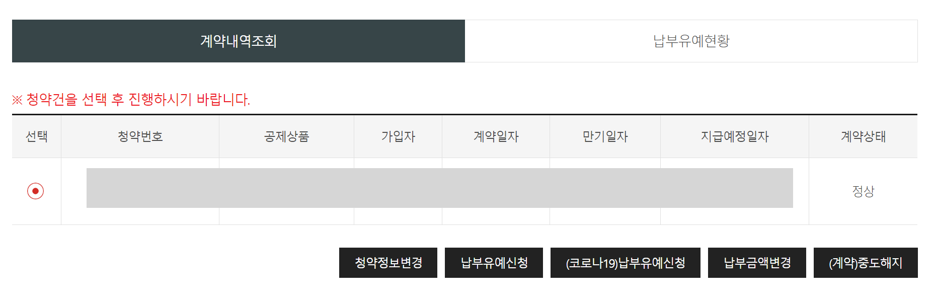 해당 카테고리를 클릭하면 계약내역을 조회할 수 있는 페이지로 이동한다. 중도해지를 하고자 하는 청약건을 선택한 후에 (계약)중도해지 라고 쓰여있는 검정색 버튼을 클릭한다.