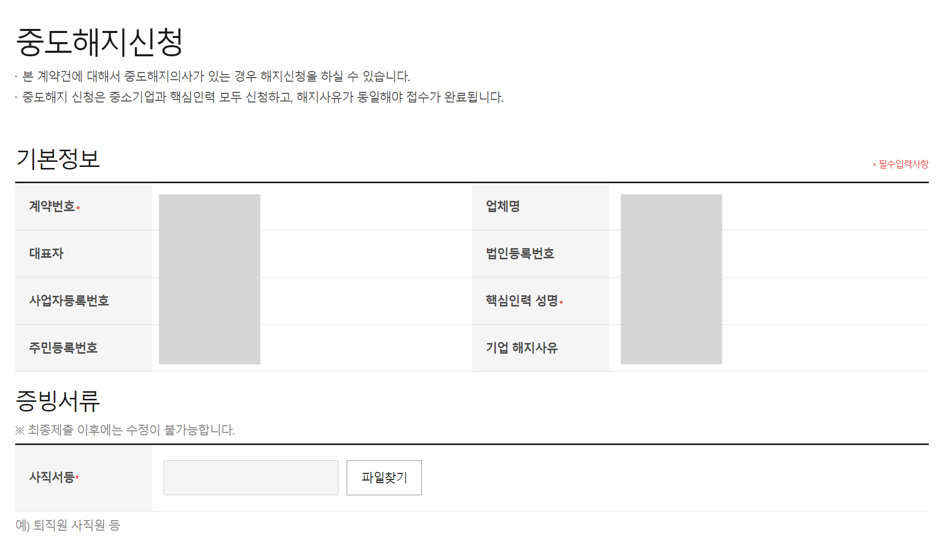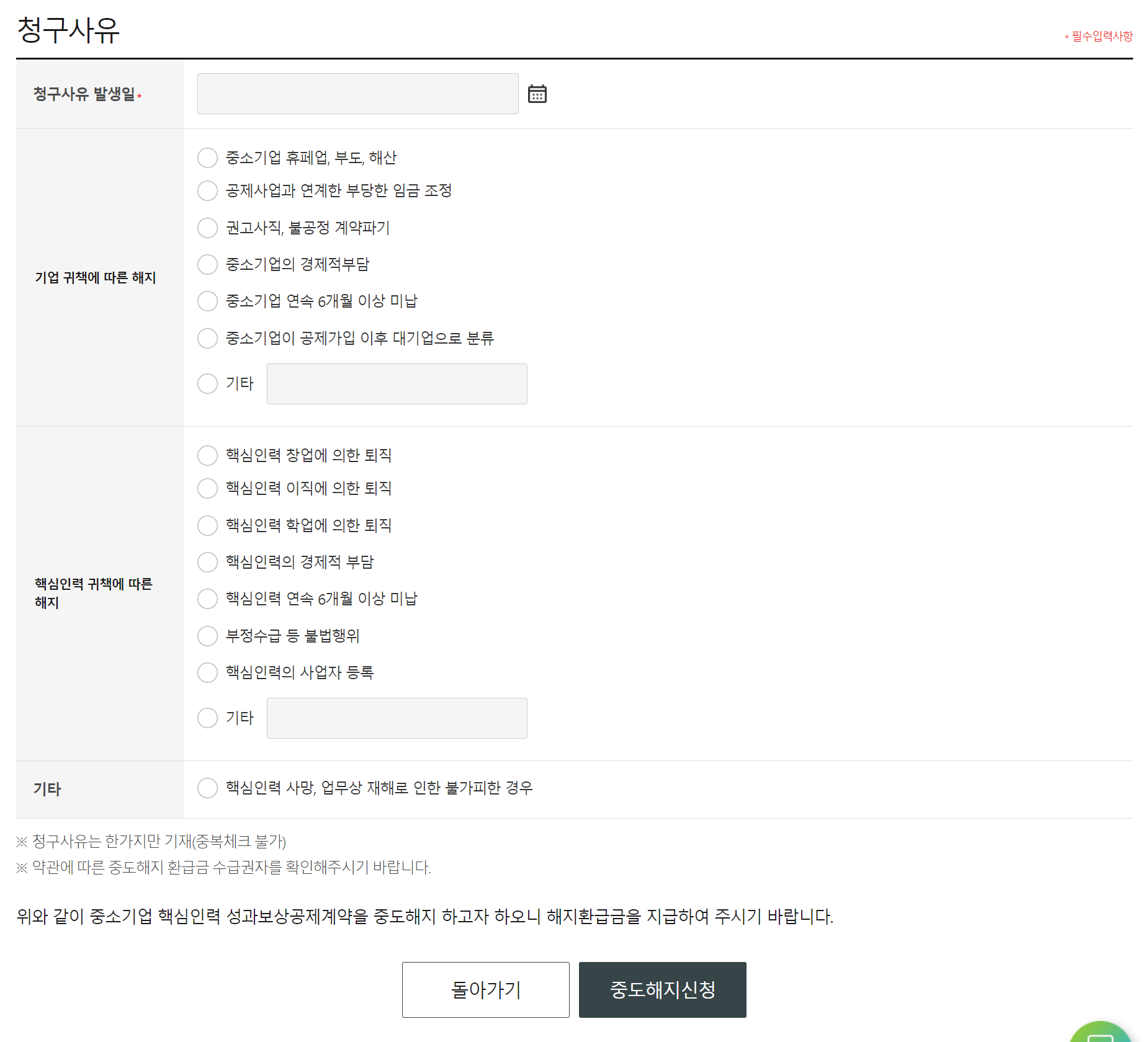아! 그리고 중요한 점, 핵심인력만 중도해지 신청을 하면 끝나는 게 아니라 기업에서도 함께 신청을 해 주어야 한다. 이 때 신청사유가 동일해야 접수가 완료된다고 하니 꼭 기억하도록 하자!