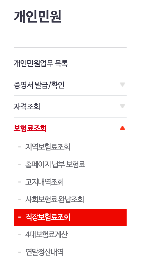 국민건강보험공단 웹사이트(https://www.nhis.or.kr/)로 이동하여 로그인을 진행하자. 아직까지 이 블로그를 보고 서류를 준비했다면 이미 로그인이 되어있는 상태일 것이다. 상단 메뉴바에서 민원 여기요 > 개인민원을 선택한다. 이후 좌측 페이지에서 보험료 조회 > 직장보험료 조회 카테고리를 클릭한다.