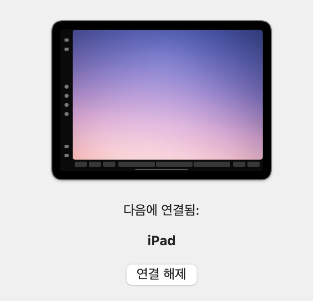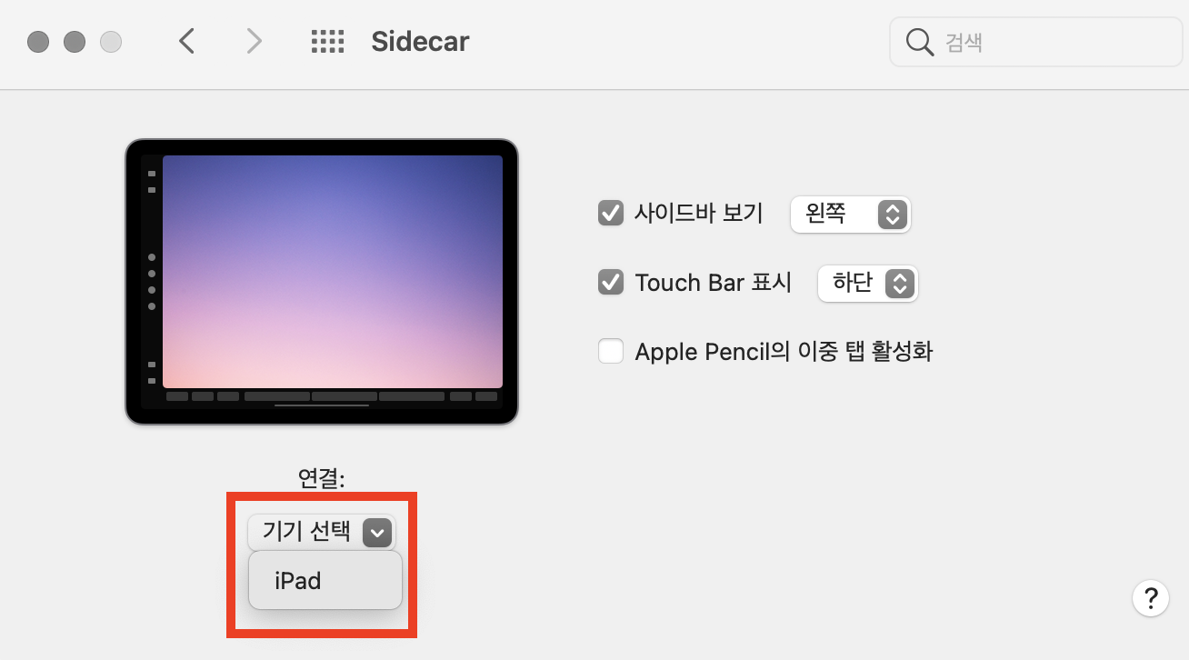 Sidecar 설정 창에서 iPad 기기를 선택해 준다. ★기기 두 대가 모두 같은 와이파이에 연결되어 있어야 함★
