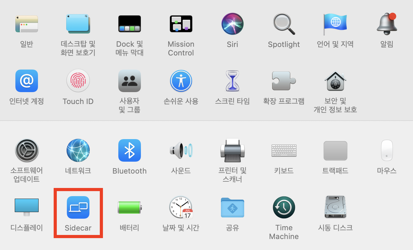 시스템 환경설정을 선택하면 여러가지 항목들을 확인할 수 있는데 그 중에서 아랫부분에 Sidecar 아이콘을 클릭한다.