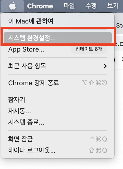 먼저 아이패드와 맥북을 나란히 놓는다. 그리고 맥북의 우측 상단 애플 로고 > 시스템 환경설정을 선택한다.