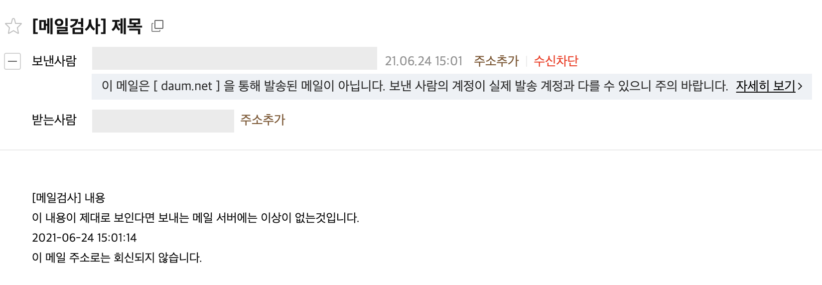 저장한 후에 다시 메일 테스트를 시도해 보았더니 [메일검사] 제목 이라는 내용의 메일을 받을 수 있었다. (감동ㅜㅜ)