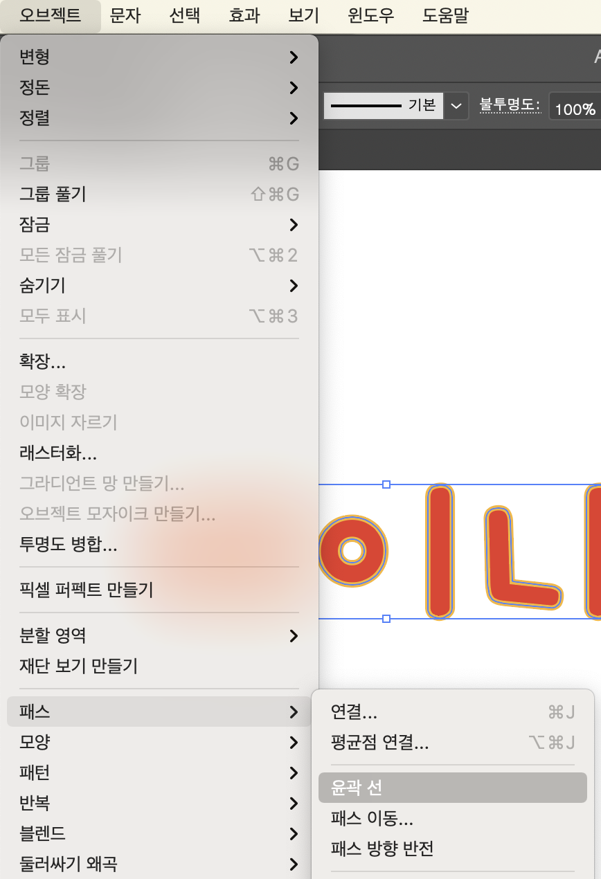 테두리를 병합하는 것도 글자를 깨는 것만큼이나 간단하다. 해당 개체를 선택한 상태로 오브젝트 > 패스 > 윤곽 선을 선택한다.