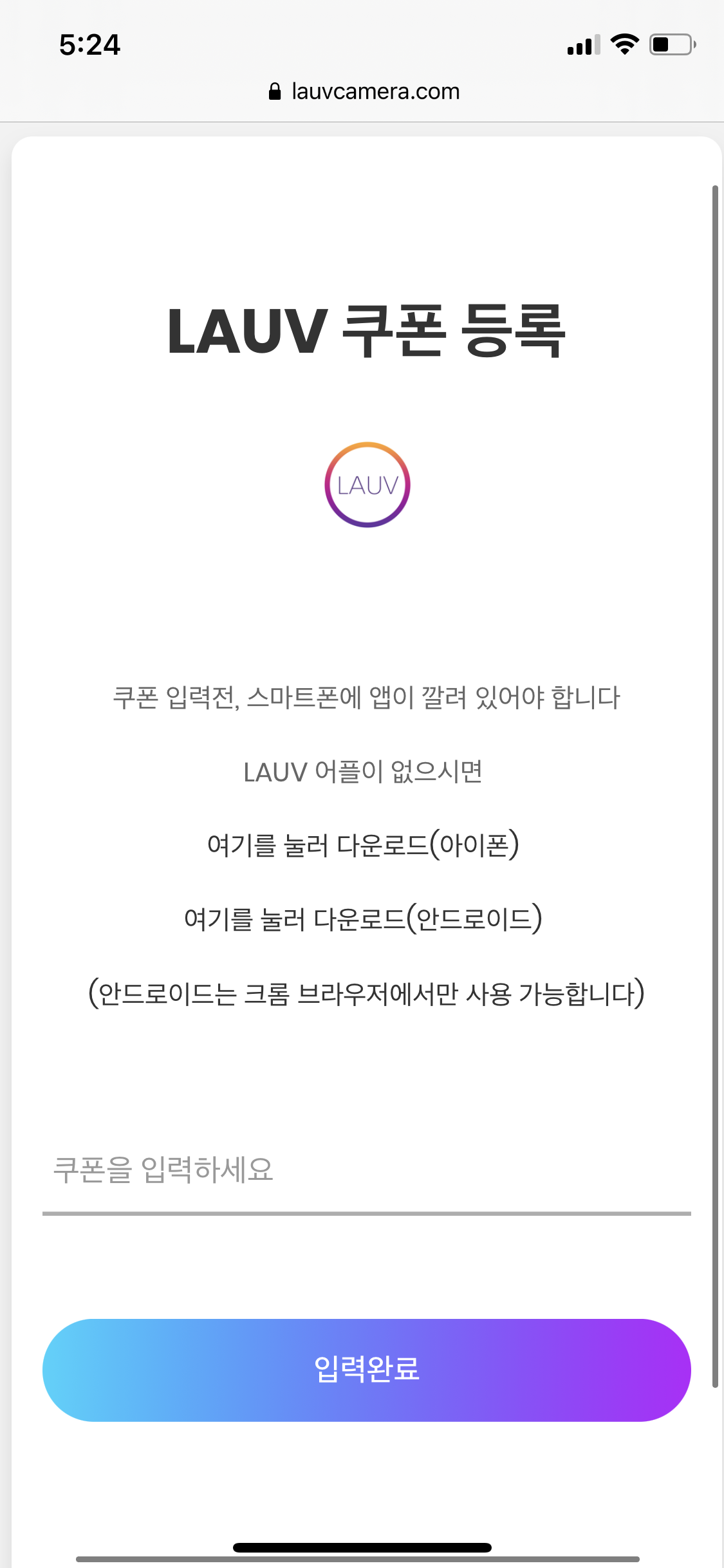 라우브 어플이 이미 깔려있는 안드로이드 또는 아이폰 브라우저에서 https://lauvcamera.com 사이트에 접속한다.