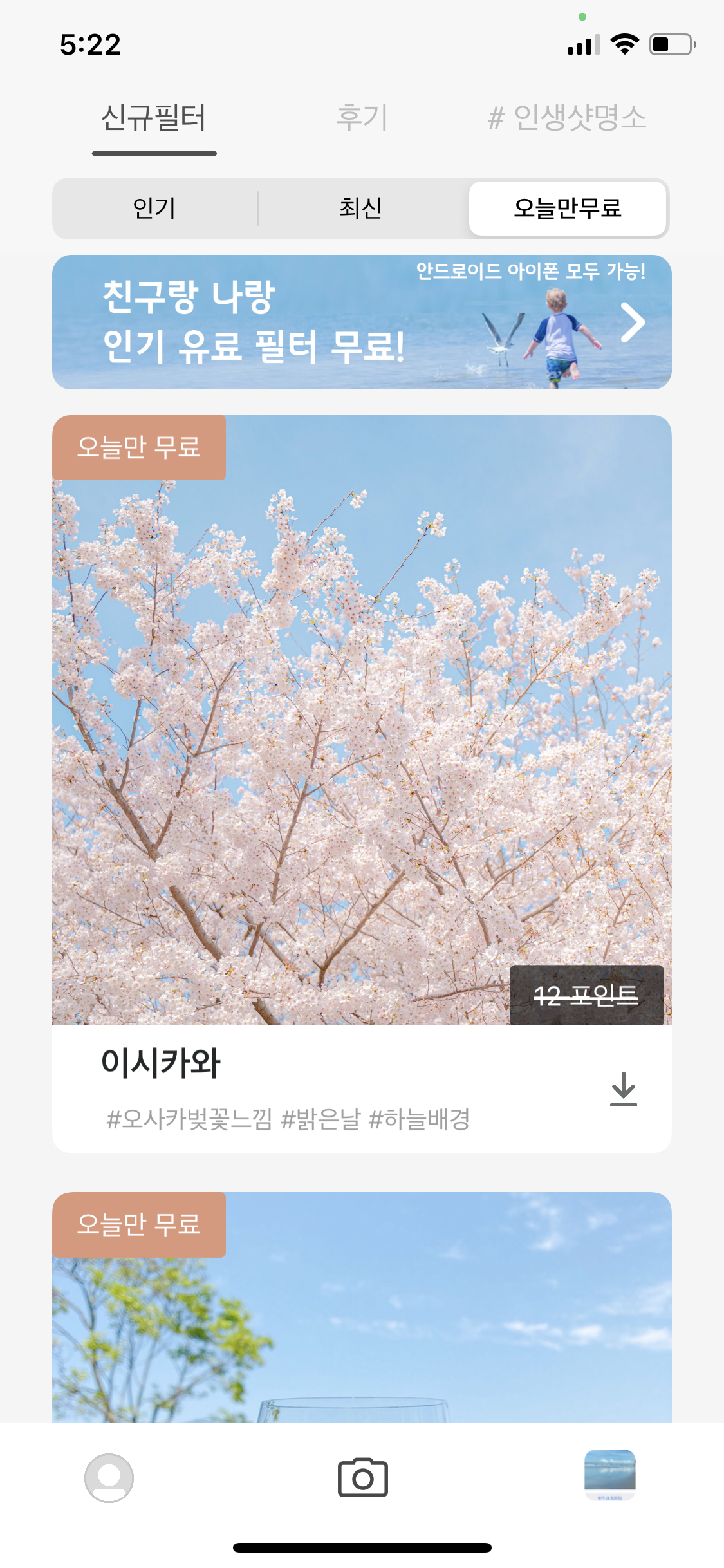 닉네임을 입력하고 본격 필터 구경 시작~ 카카오톡으로 채팅할 때 원하는 이모티콘을 구입 후 설치해서 사용하듯이, 라우브 어플도 마음에 드는 필터를 구입 또는 무료 다운로드하는 방식으로 사용할 수 있다. 오늘만 무료 탭에서 원래는 유료 필터인데 무료 이벤트 중인 필터도 사용해볼 수 있으니 개이득!