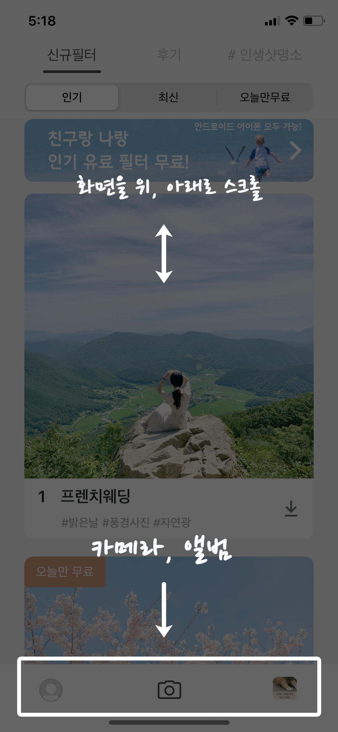 라우브 어플을 다운로드하고 실행하면 큰 카테고리는 신규필터, 후기, #인생샷명소로 나뉘어져 있고, 각 카테고리를 선택하면 간단한 가이드를 확인할 수 있다.