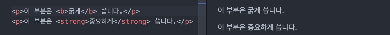 <b> 태그와 <strong> 태그는 웹페이지에서 확인할 때는 똑같이 볼드체로 보인다. <i> 태그와 <em> 태그도 마찬가지로 동일하게 이탤릭체로 표기된다. 하지만 이 태그들은 시각적으로는 똑같아 보일지 몰라도, 알고 보면 각각 다른 의미를 가지고 있다.