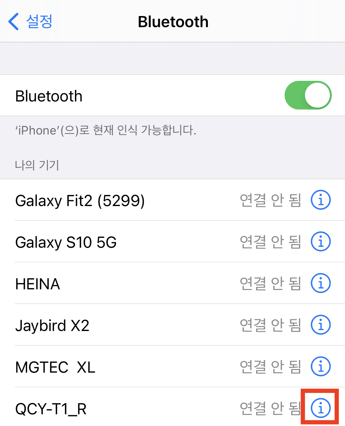 다시 충전케이스에서 이어폰을 빼고 핸드폰 설정 > 블루투스로 이동해 QCY-T1_R(오른쪽) 이어폰을 연결한다. 양쪽 모두 한꺼번에 잘 들리는 것을 확인할 수 있었다.