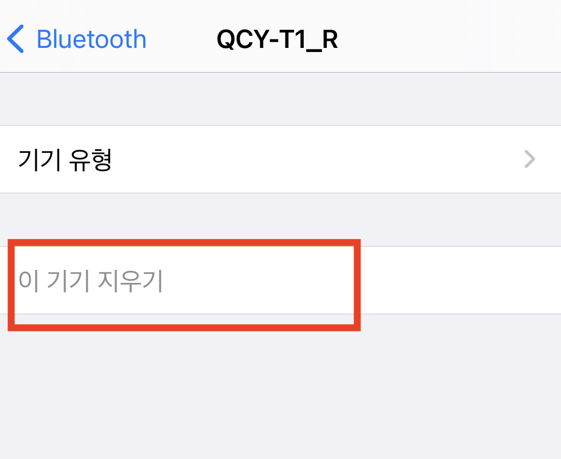 가장 먼저 이어폰과 연결된 블루투스를 해제해야 한다. 아이폰의 경우 아래와 같이 설정 > Bluetooth > 해당 기기 우측의 파란색 아이콘을 눌러서 이 기기 지우기를 선택하면 블루투스 목록에서 해당 기기가 지워진다.