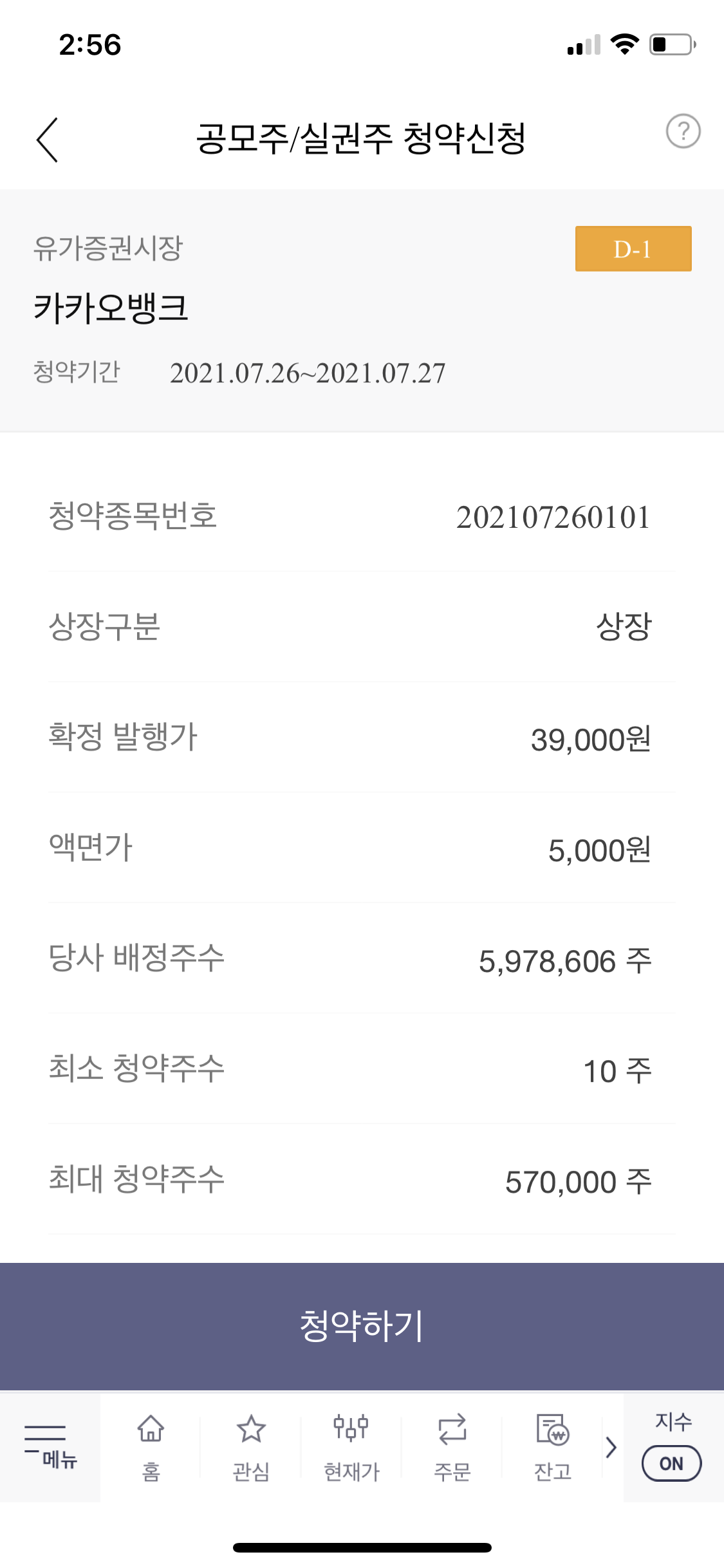 여담은 여기까지, 이제 정말 공모주를 청약하러... 아! 그 전에 개설한 계좌로 청약비용도 미리 입금을 해 두도록 하자. 카카오뱅크 최소 청약 수량은 10주이다. 공모가가 39,000원이고 청약 증거금률은 50%를 적용한다. 그러므로 최소 수량을 적용하여 10주를 청약한다고 하면 최소 195,000원 + 청약 수수료가 필요하다. (수수료는 증권사마다 다르니 대충 20만원 정도로 생각)