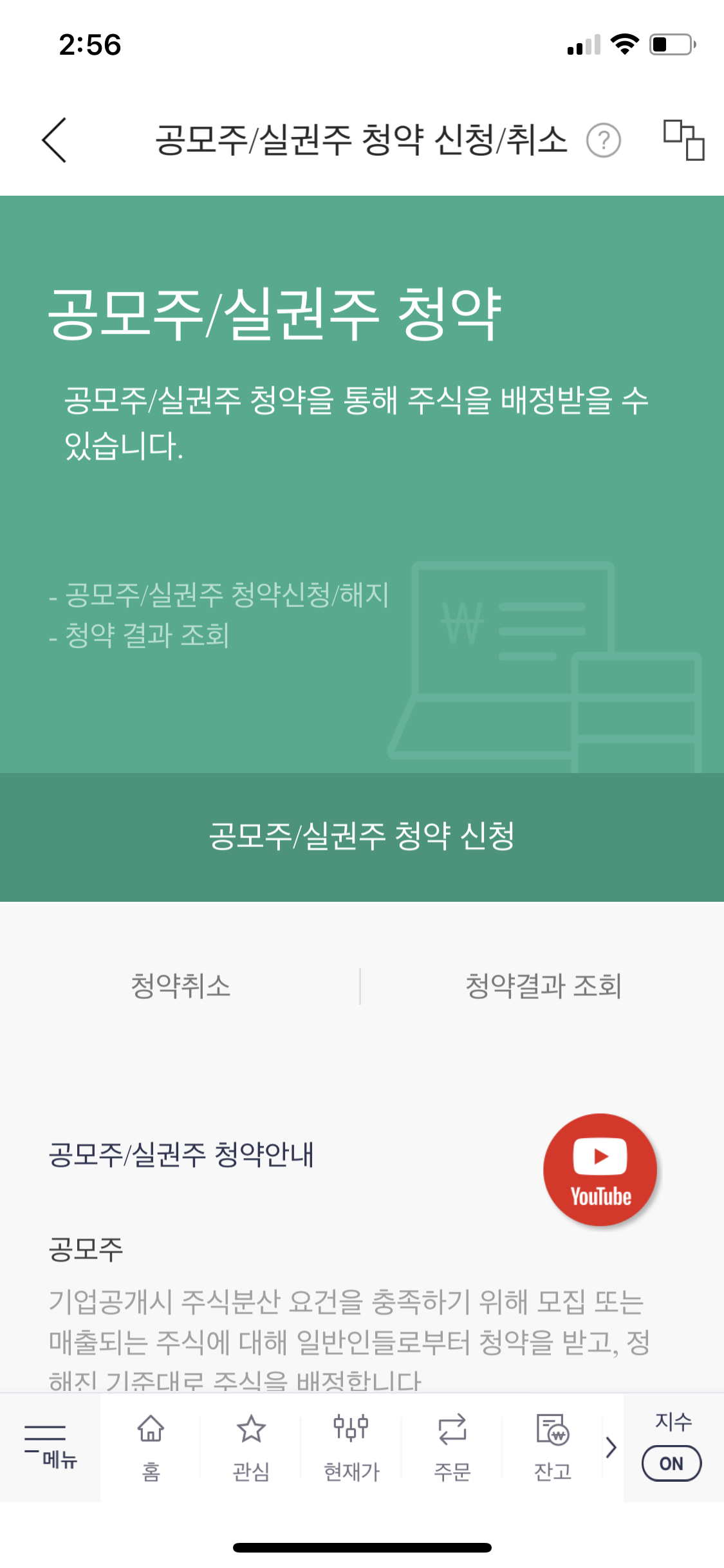 한국투자증권 어플의 첫페이지에서 좌측 하단에 위치한 '메뉴' 아이콘을 누른다. 그 다음 검색창에 공모주를 입력하고 청약 > 공모주/실권주 청약 신청/취소 서비스를 선택하면 해당 페이지로 이동한다. 초록색 청약 신청 버튼을 클릭!