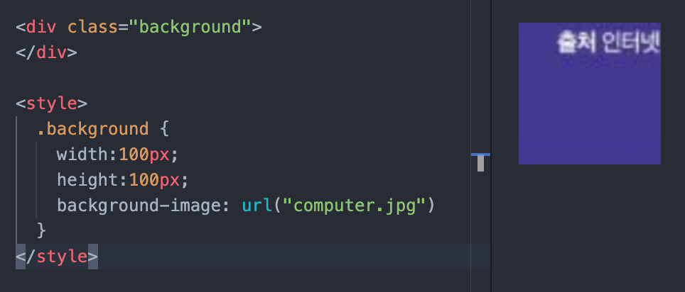 배경에 이미지(사진)를 넣고 싶을 때 사용한다. 아래와 같이 경로를 사용하여 지정하면 된다. 미리 준비한 배경이미지를 넣어 보았는데 div의 너비와 폭이 100px로 지정되어 있어 배경이미지가 잘려 보인다. 이럴 때 배경이미지를 꽉 찬 상태로 모두 보고 싶다면 배경이미지 사이즈를 조절하면 된다. (배경이미지 사이즈와 관련된 속성은 아래에 따로 정리되어 있음)