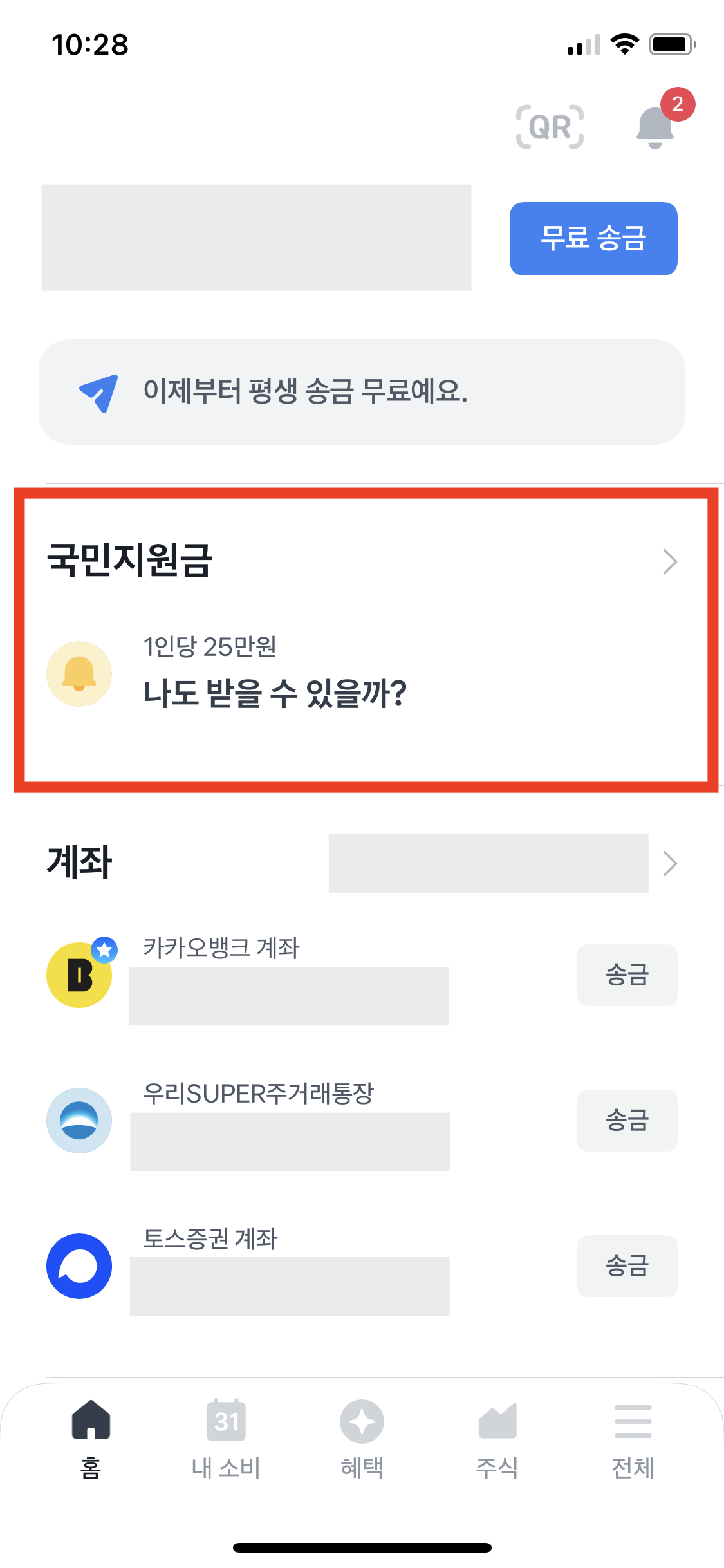 토스 앱을 실행하면 보이는 첫 화면(홈) 중간 부분에서 "국민지원금 1인당 25만원 나도 받을 수 있을까?" 문구를 확인할 수 있을 것이다. 우측 화살표를 눌러서 페이지로 이동한다.