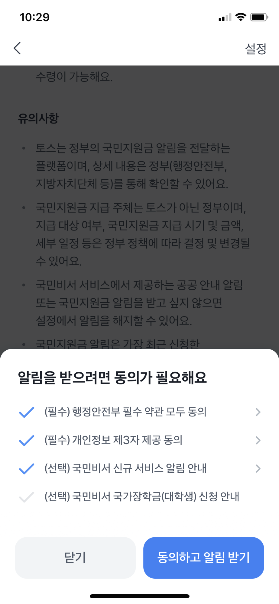 내용을 확인한 후에 알림 동의 버튼을 눌러야 신청이 완료된다.