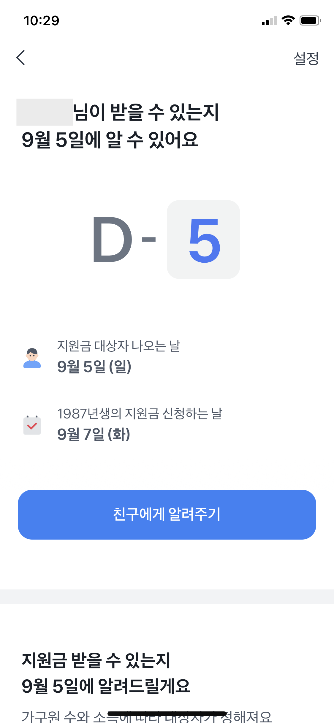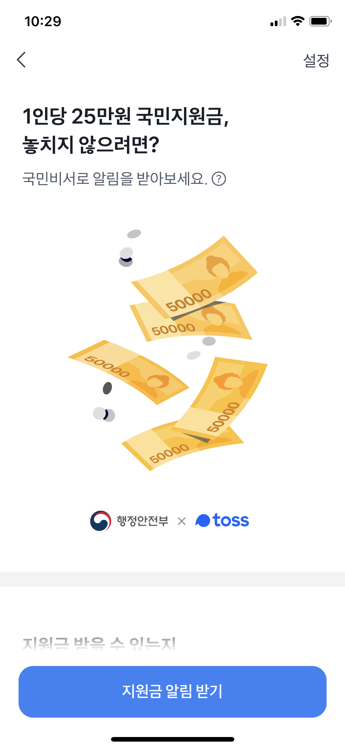 하단의 파란색 지원금 알림받기 버튼을 선택한다.
