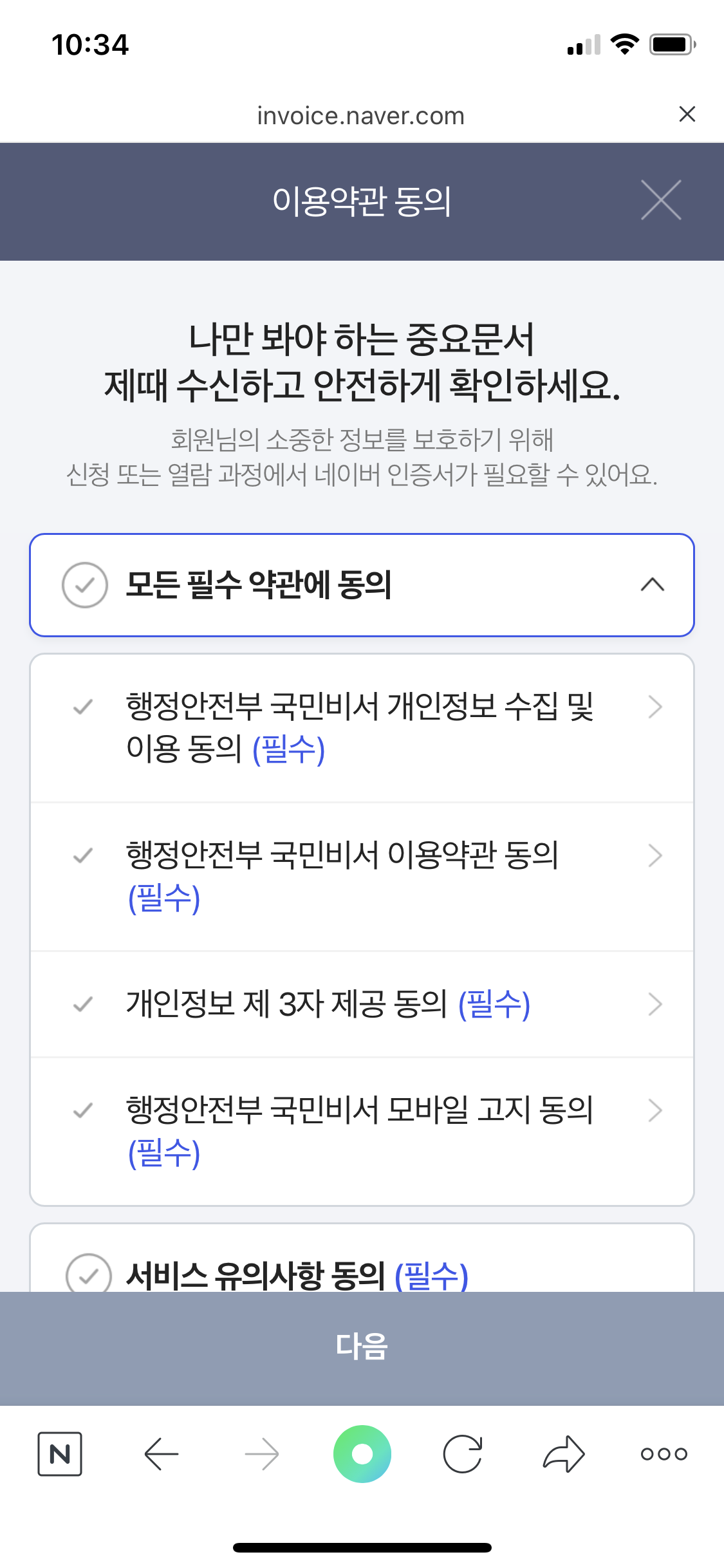 이용약관을 읽고 모든 필수 약관에 동의 체크 후 다음 버튼을 누른다.