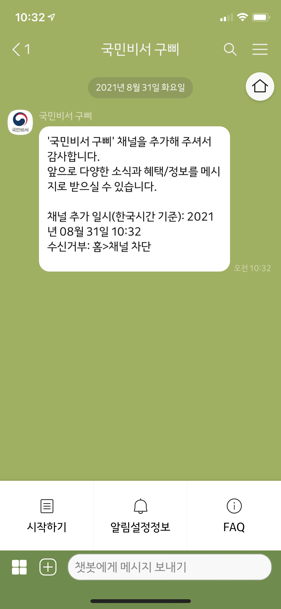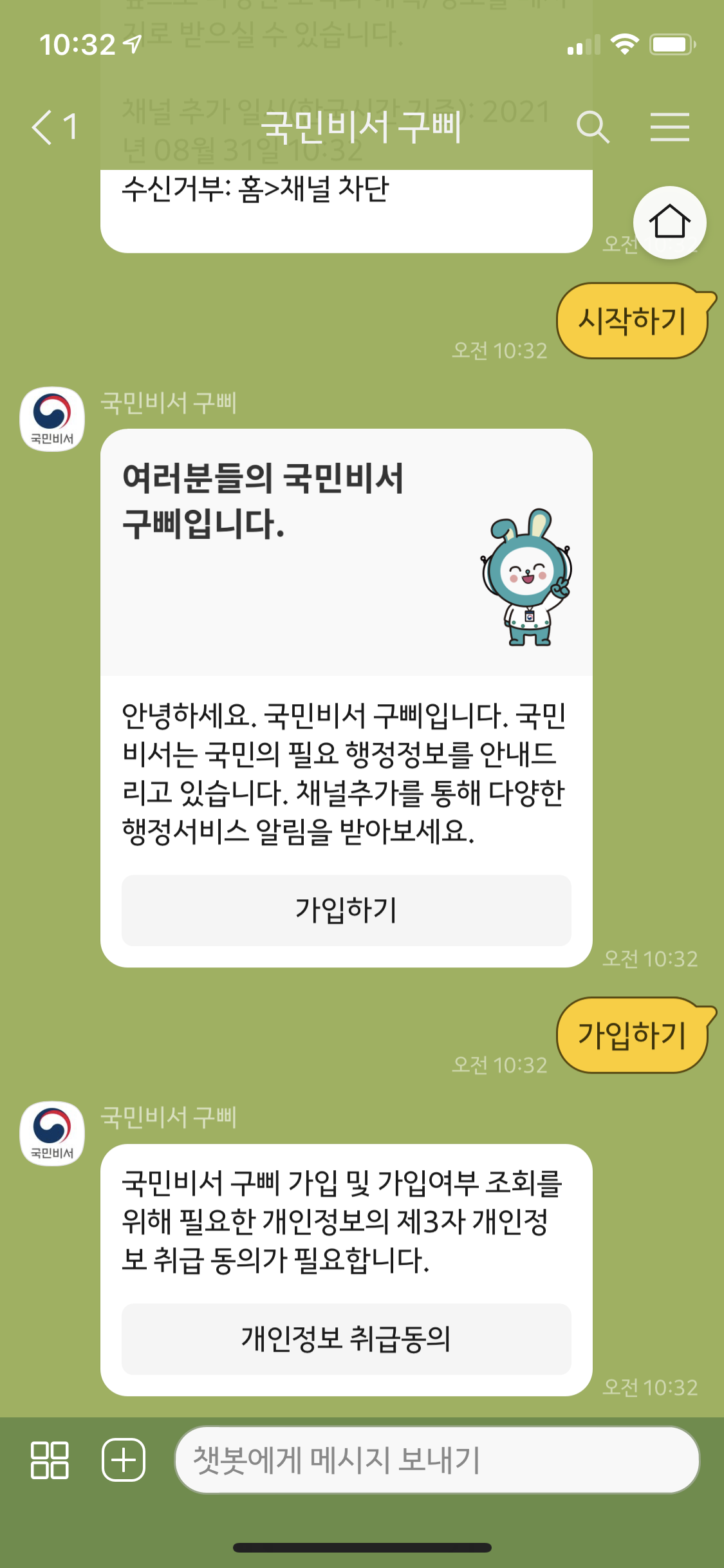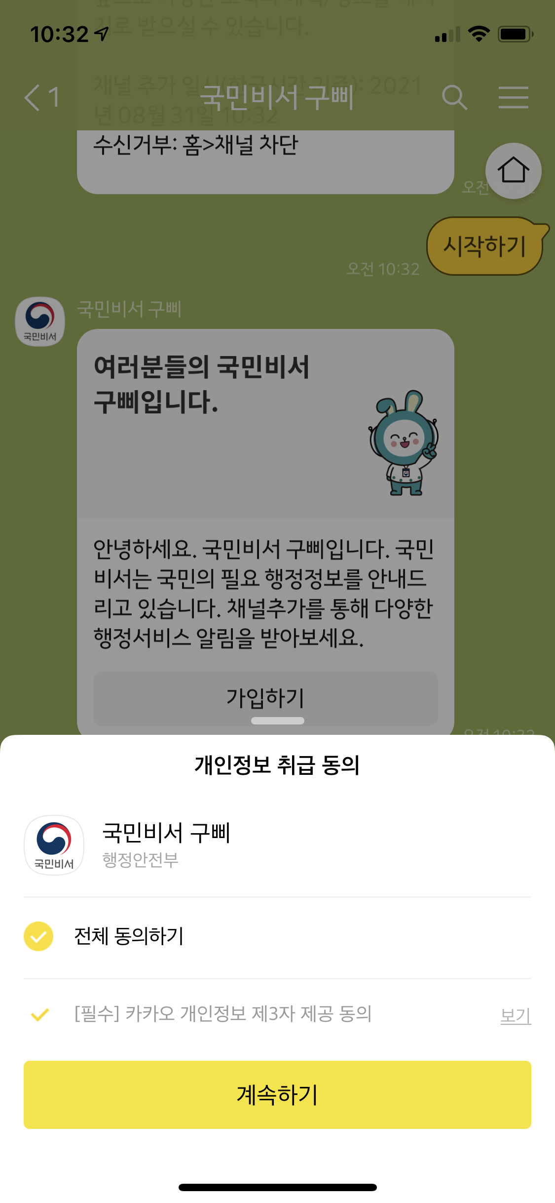 그 다음 국민비서 구삐 채팅창으로 이동해서 하단에 있는 시작하기 버튼을 누른다. 시작하기 버튼을 누르면 채널 추가를 통해 다양한 행정서비스 알림을 받아보라는 메세지와 함께 가입하기 버튼이 표시되는데 이것도 누른다. 다음으로 개인정보 취급동의 버튼도 눌러서 전체 동의하기 체크박스 선택 후 계속하기 버튼 클릭!