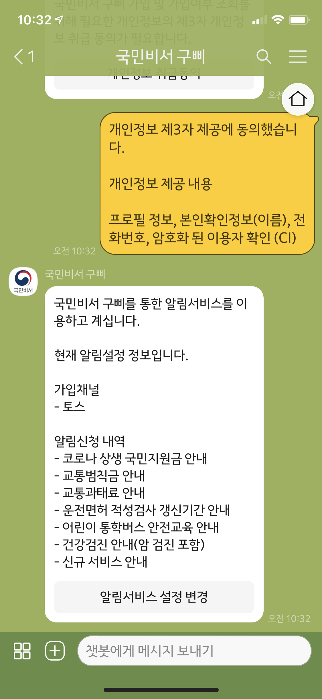 여기까지 하면 신청이 모두 완료된 것이다. (진짜 끝!) 신청을 하면 국민비서가 가입되어 있는 채널이 표시되며, 현재 알림신청을 받고 있는 내역도 함께 확인할 수 있다. 나는 토스에서 국민비서를 신청했기 때문에 해당 앱이 표시된 것이고, 알림받는 채널을 바꾸고 싶다면 메세지 하단에 있는 알림서비스 설정 변경 버튼을 눌러서 네이버앱 또는 카카오톡으로 변경도 가능하다.
