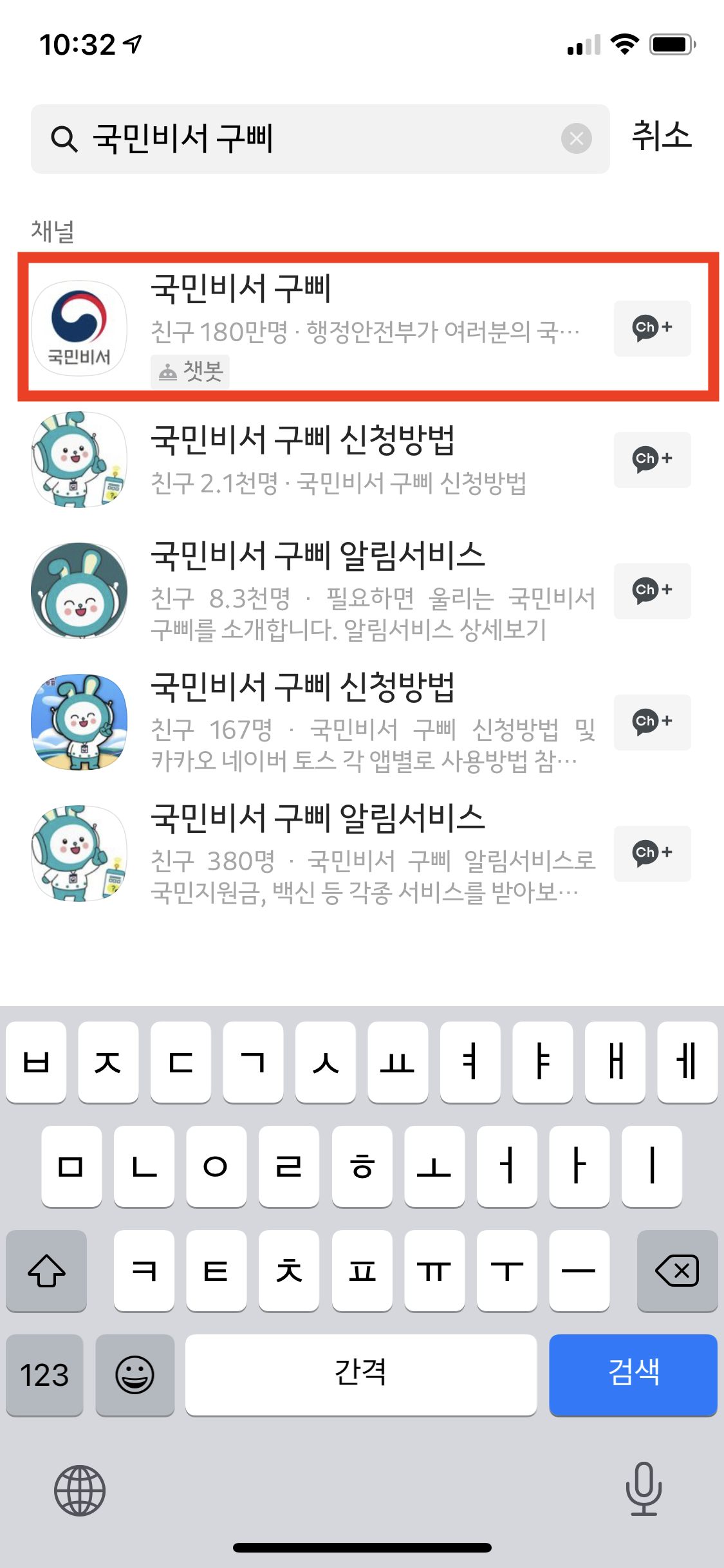 먼저 카카오톡 앱을 실행한다. 친구 리스트 우측 상단에 돋보기 아이콘을 선택한 후에 "국민비서 구삐"라고 검색하면 가장 처음 보이는 채널이 있다. 우측 CH+ 버튼을 눌러서 친구로 추가해 준다.