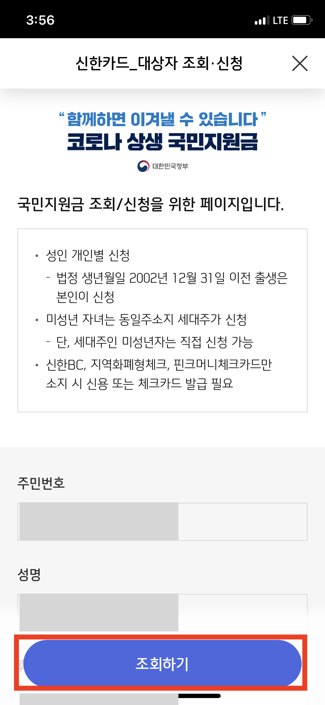신한카드_국민지원금 이용안내 페이지에서 '조회/신청하기' 버튼을 누르면 국민지원금 조회/신청을 위한 페이지로 이동한다. 법정 생년월일 2002년 12월 31일 이전 출생자는 본인이 직접 신청하고, 미성년 자녀는 동일주소지 세대주가 신청해야 한다.