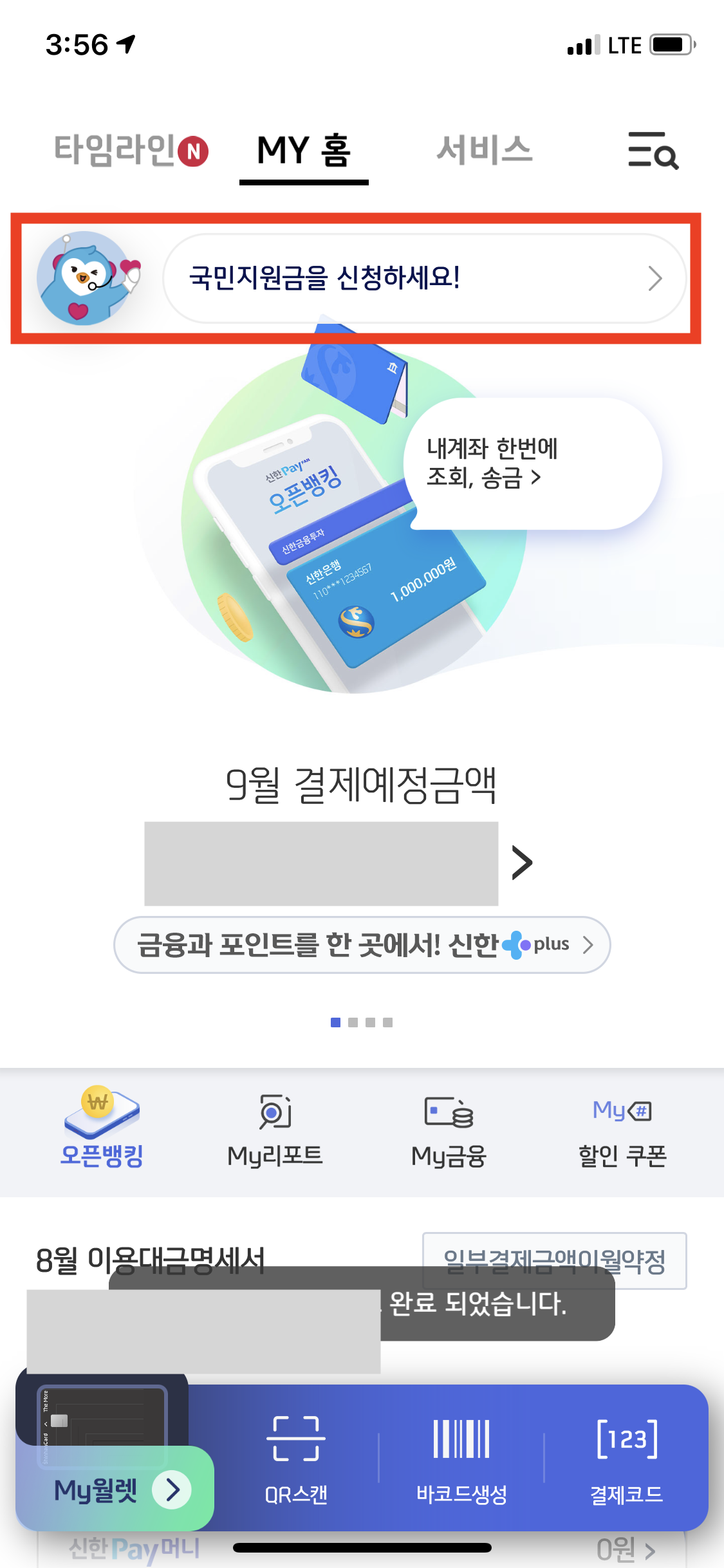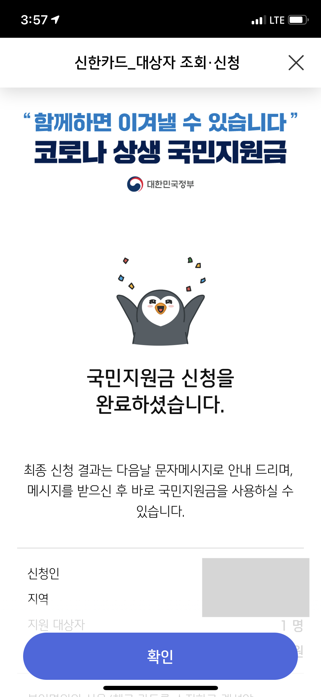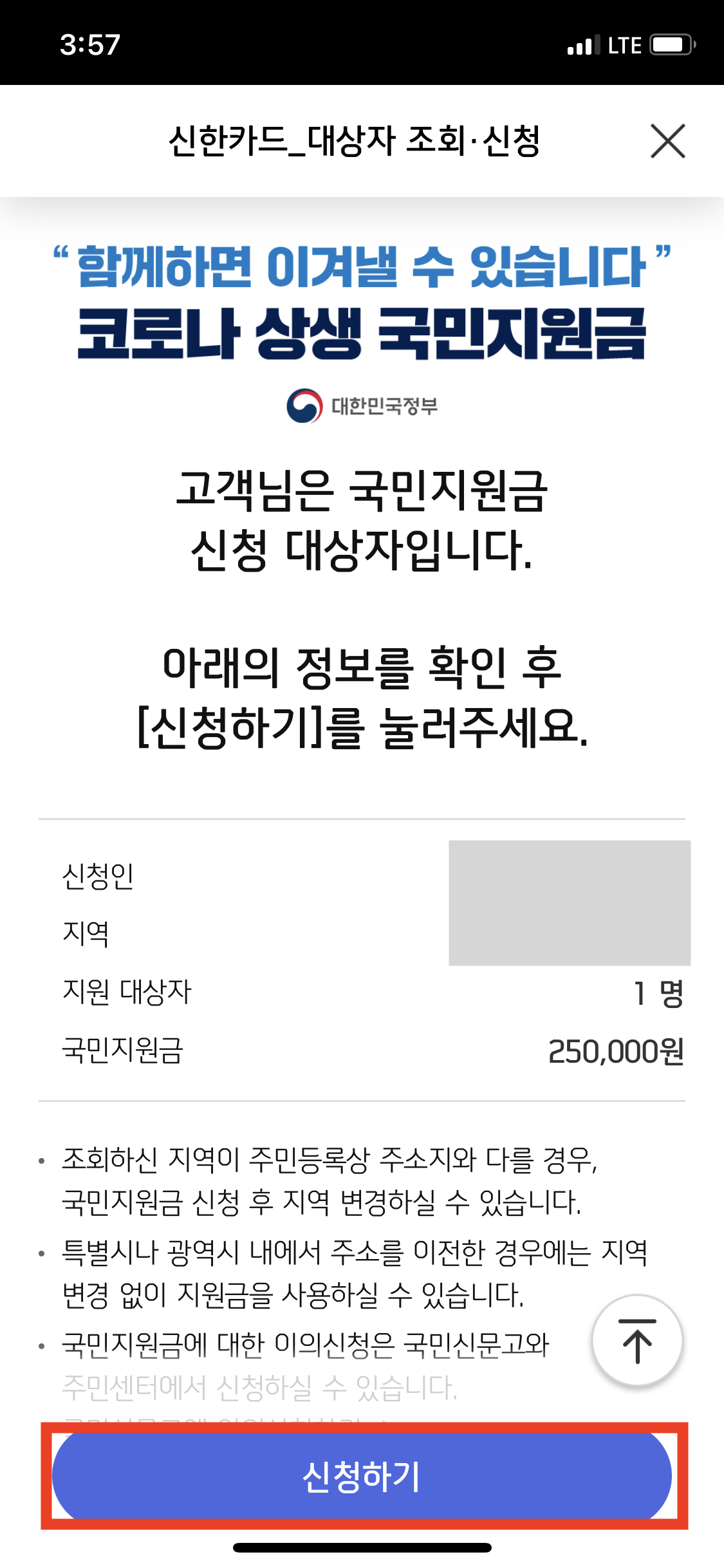 개인정보를 최종 확인 후에 '신청하기' 버튼을 누르면 국민지원금 신청이 모두 완료된 것이다.