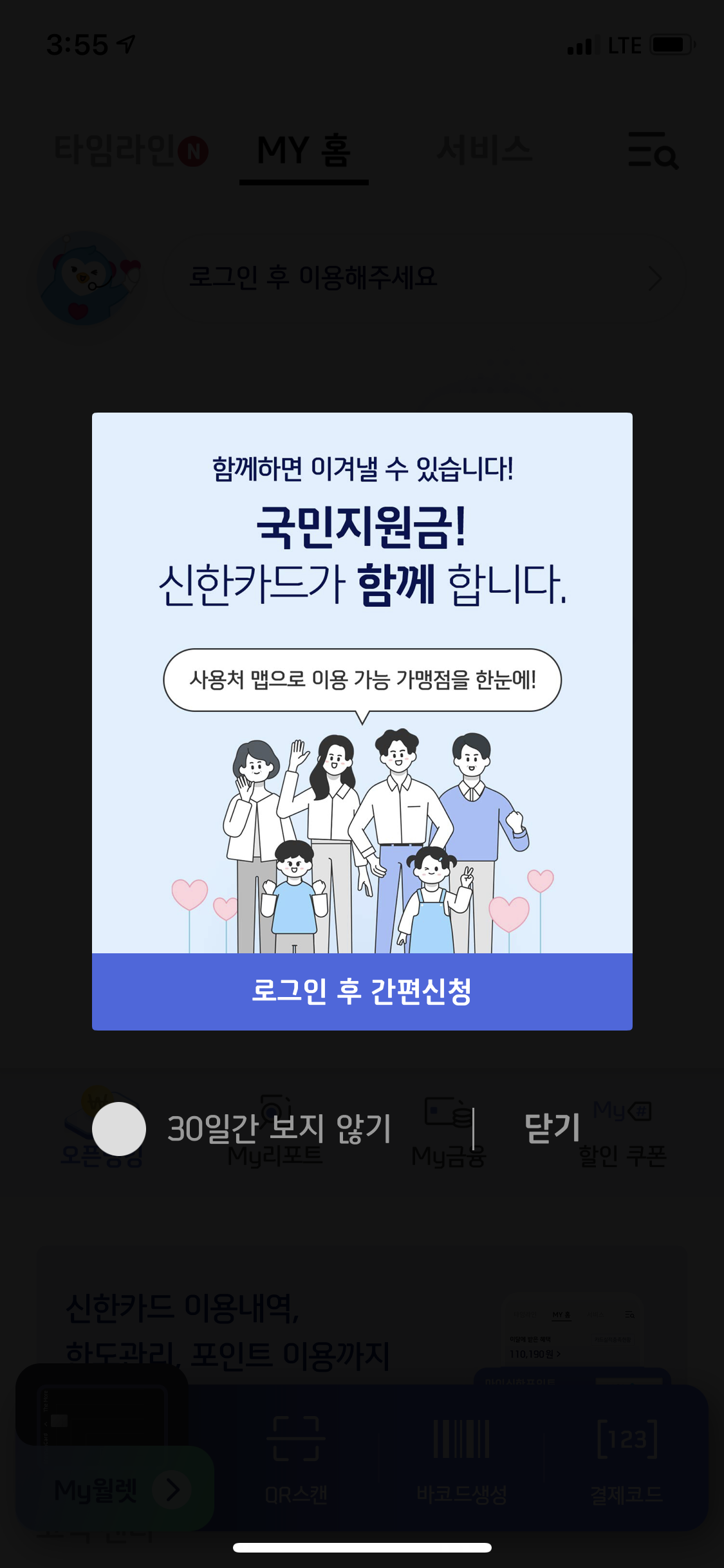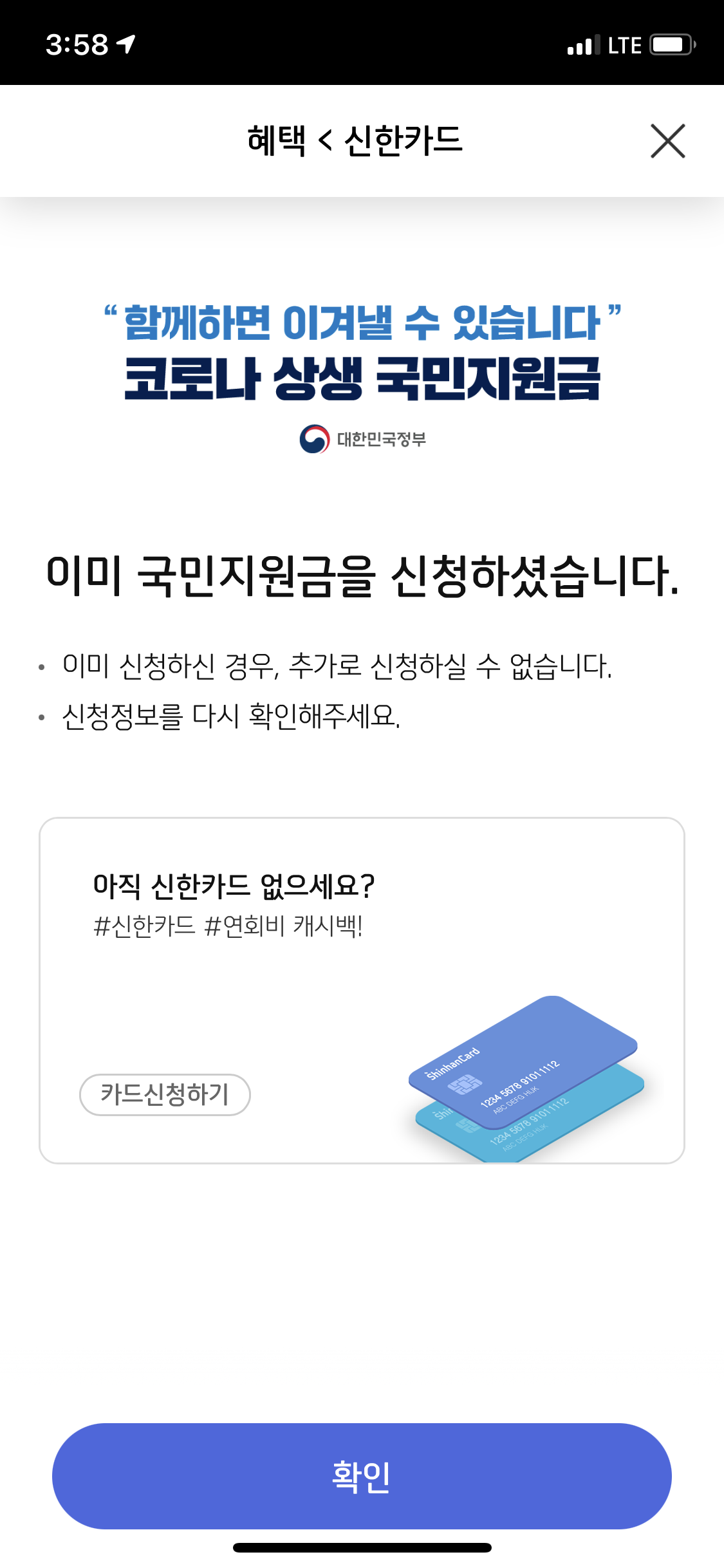 출생년도 끝자리 기준으로 월요일 1,6 / 화요일 2,7 / 수요일 3,8 / 목요일 4,9 / 금요일 5,0 인 사람이 국민지원금을 신청할 수 있다. 예를 들어 1993년에 출생한 사람은 수요일에 신청이 가능한 것이다. 오늘이 내 출생년도 끝자리의 신청 가능 요일이라서 나도 국민지원금을 신청했다. 어떤 카드로 신청을 할까 고민하다가 요즘 주로 사용하고 있는 신한카드로 국민지원금을 받기로 했다.