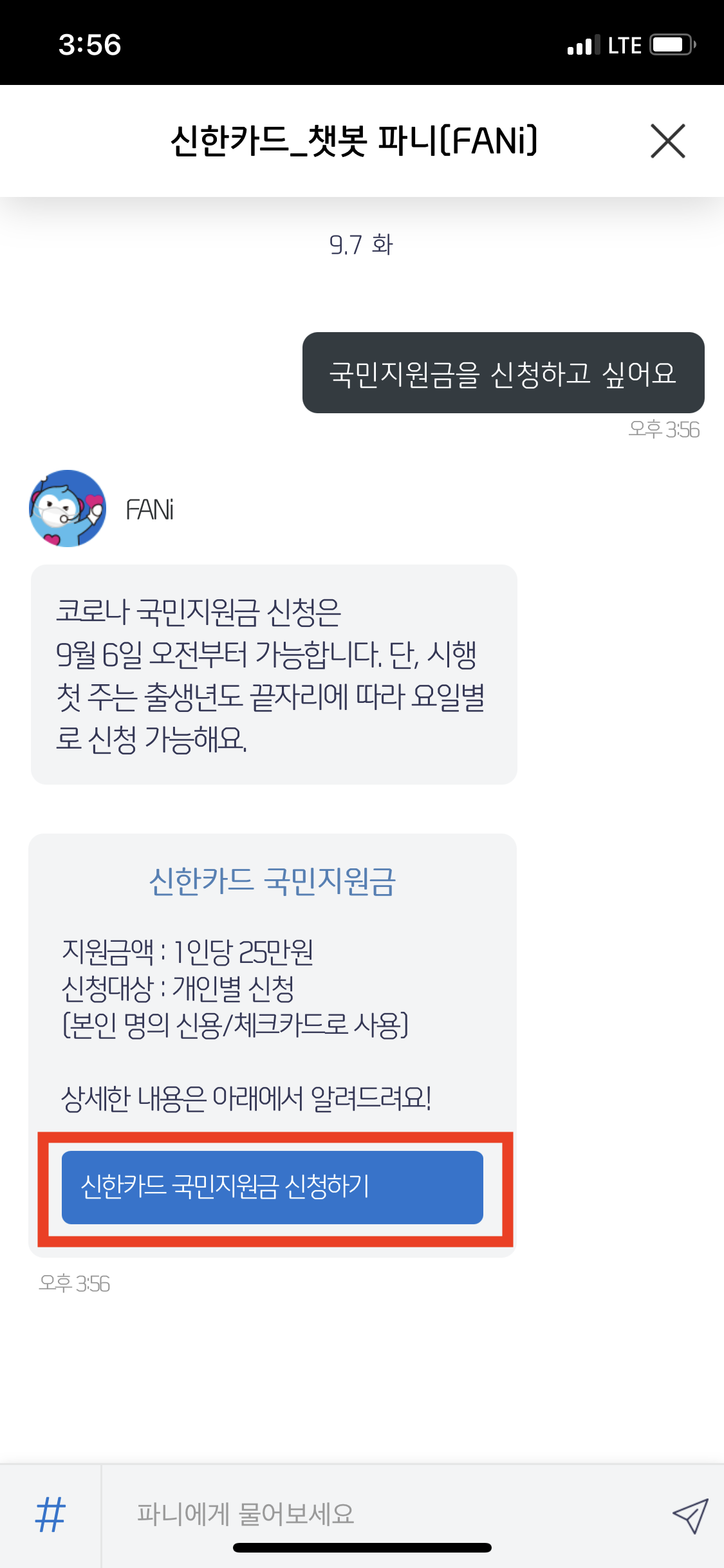 채팅창에서 신한카드 국민지원금 신청하기 버튼을 누른다.