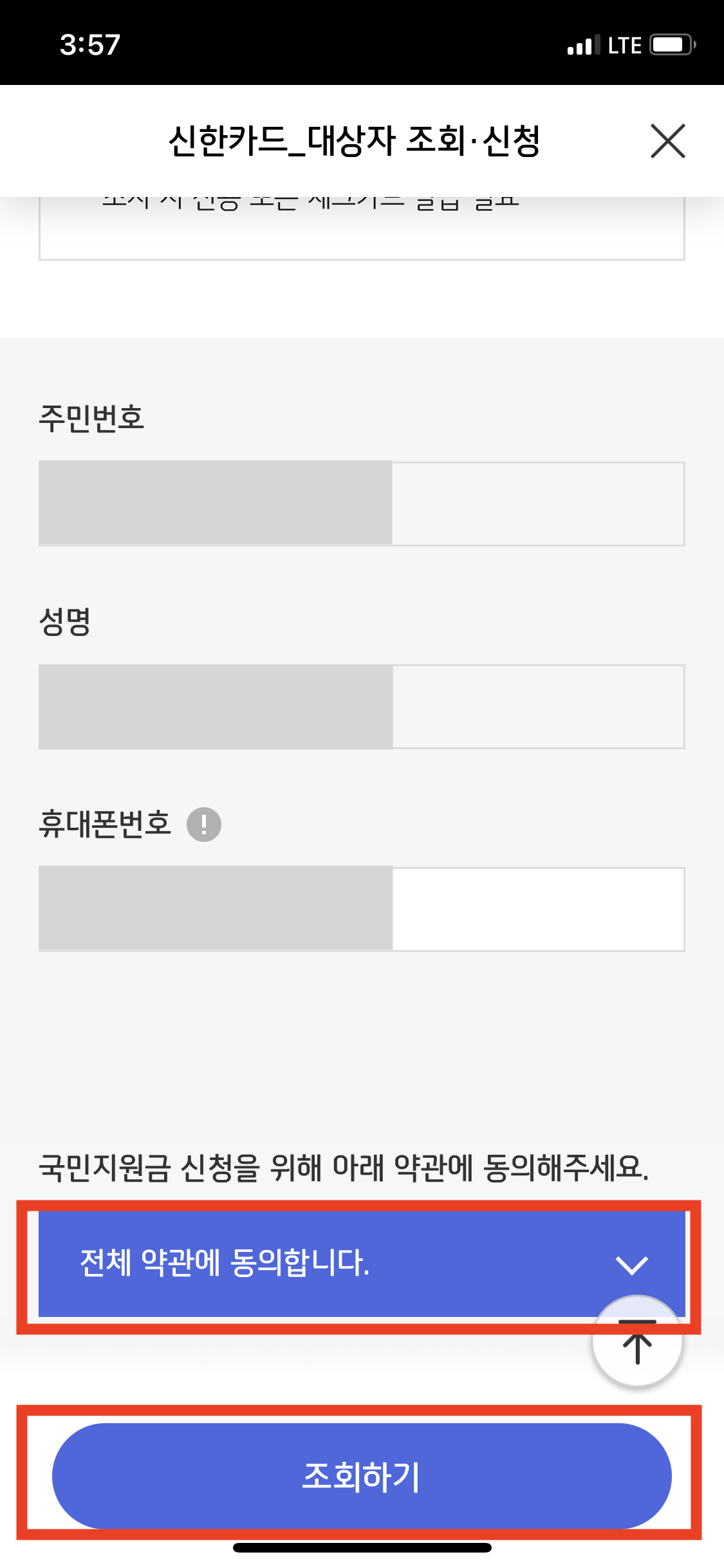 주민번호, 성명, 휴대폰번호가 맞는지 확인한 후에 전체 약관에 동의하고 '조회하기' 버튼을 누른다.