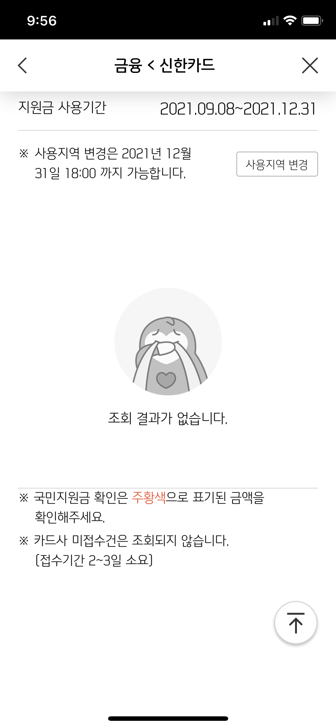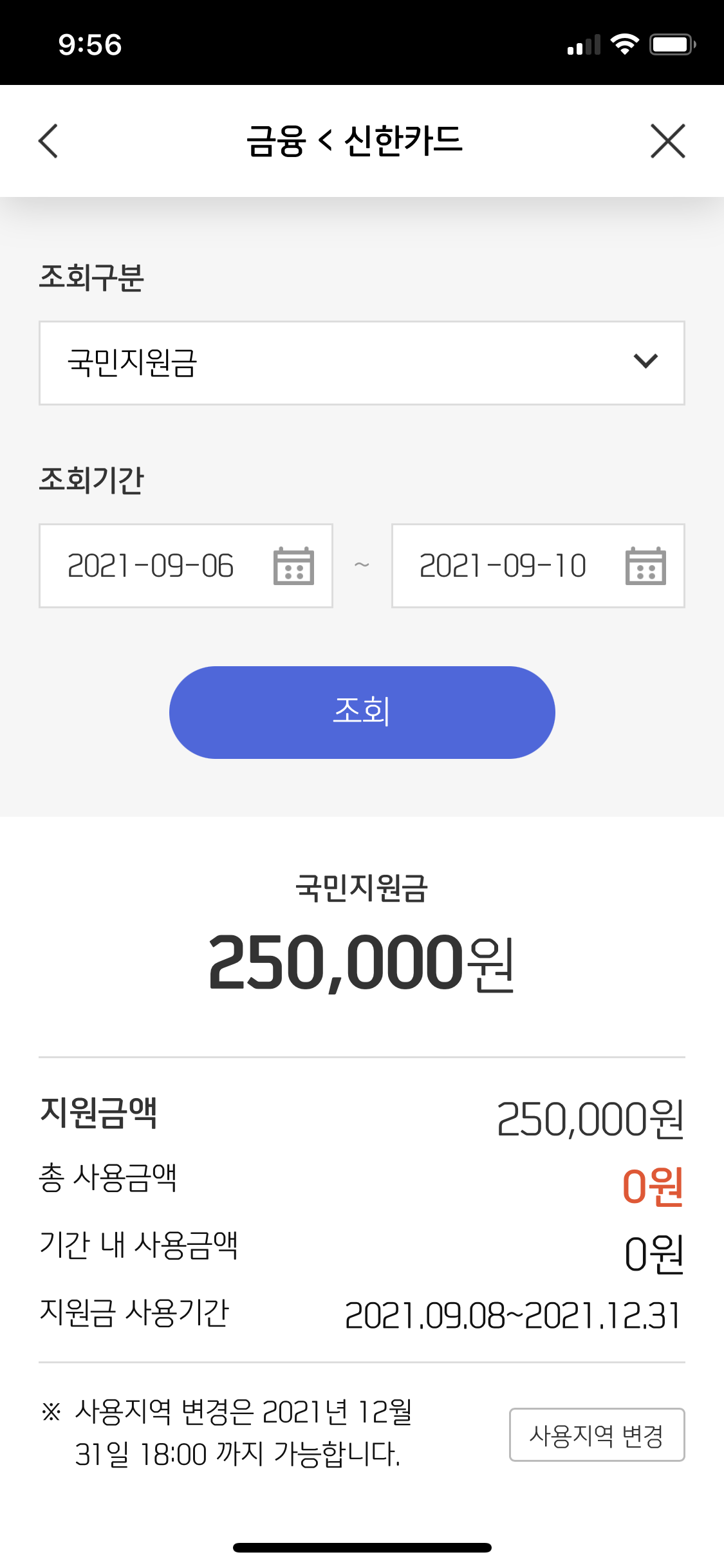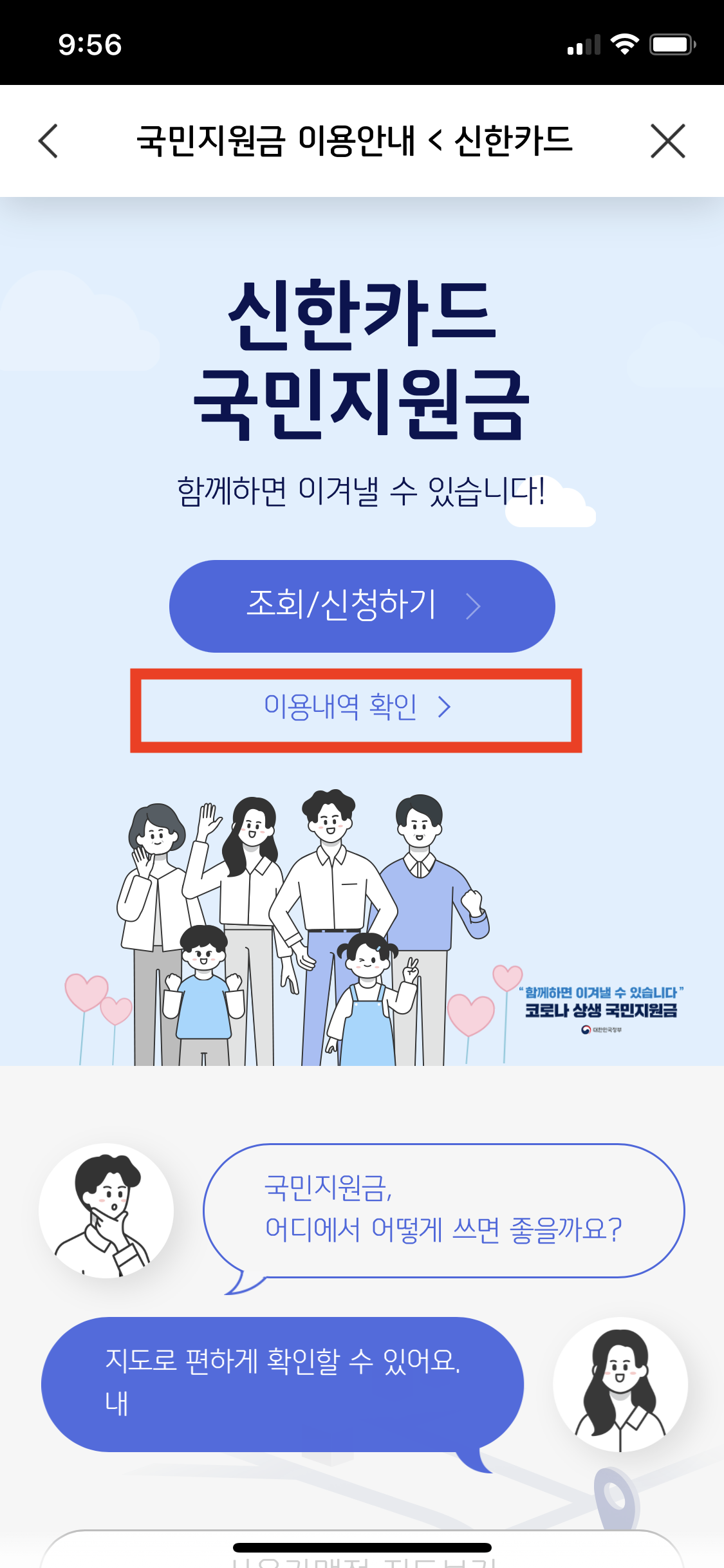 그러면 신한카드 국민지원금 신청 페이지로 이동한다. 지난번에 했던 조회/신청하기 버튼 아래로 '이용내역 확인 >' 이라는 버튼이 있다. 이 버튼을 누르면 국민지원금 잔액을 확인할 수 있는데, 조회기간을 설정해서 특정 기간에 사용한 지원금을 볼 수도 있다.