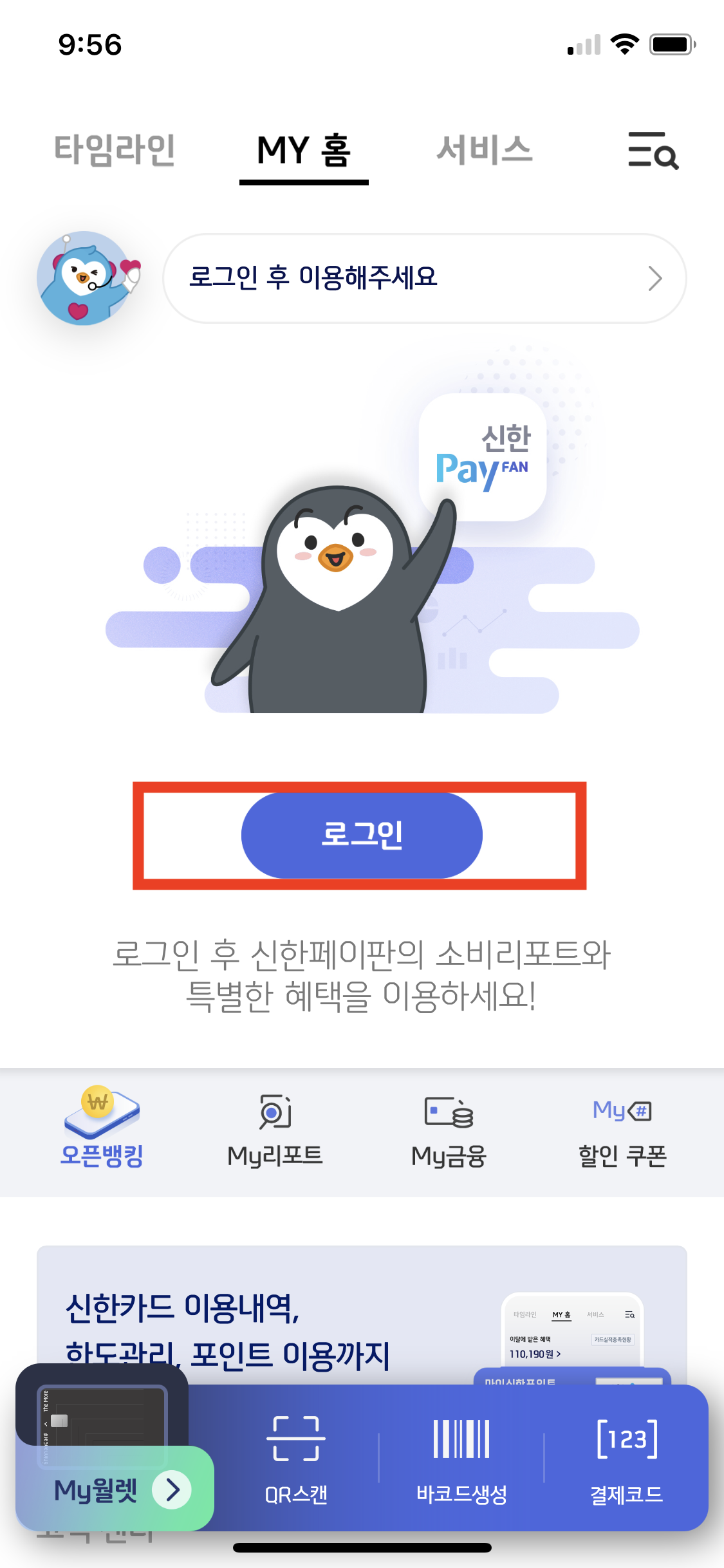 카드사에서 결제할 때마다 알려주긴 하지만, 그냥 국민지원금 잔액이 얼마 남았는지 알고 싶을 때도 있다. 그럴 때에는 신한페이판 앱을 이용하여 잔액을 확인하면 된다.