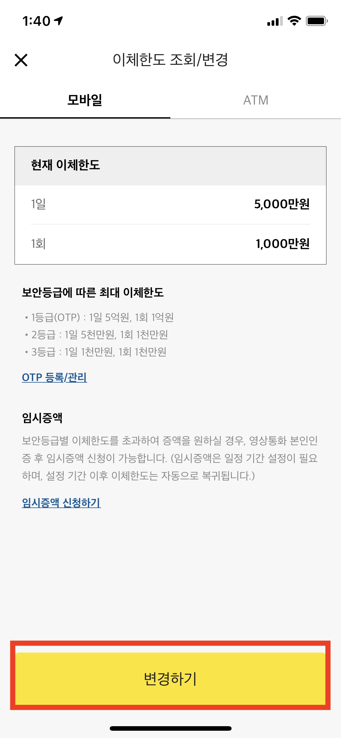 이체 한도를 변경하고 싶다면 하단의 노란색 '변경하기' 버튼을 클릭한다.