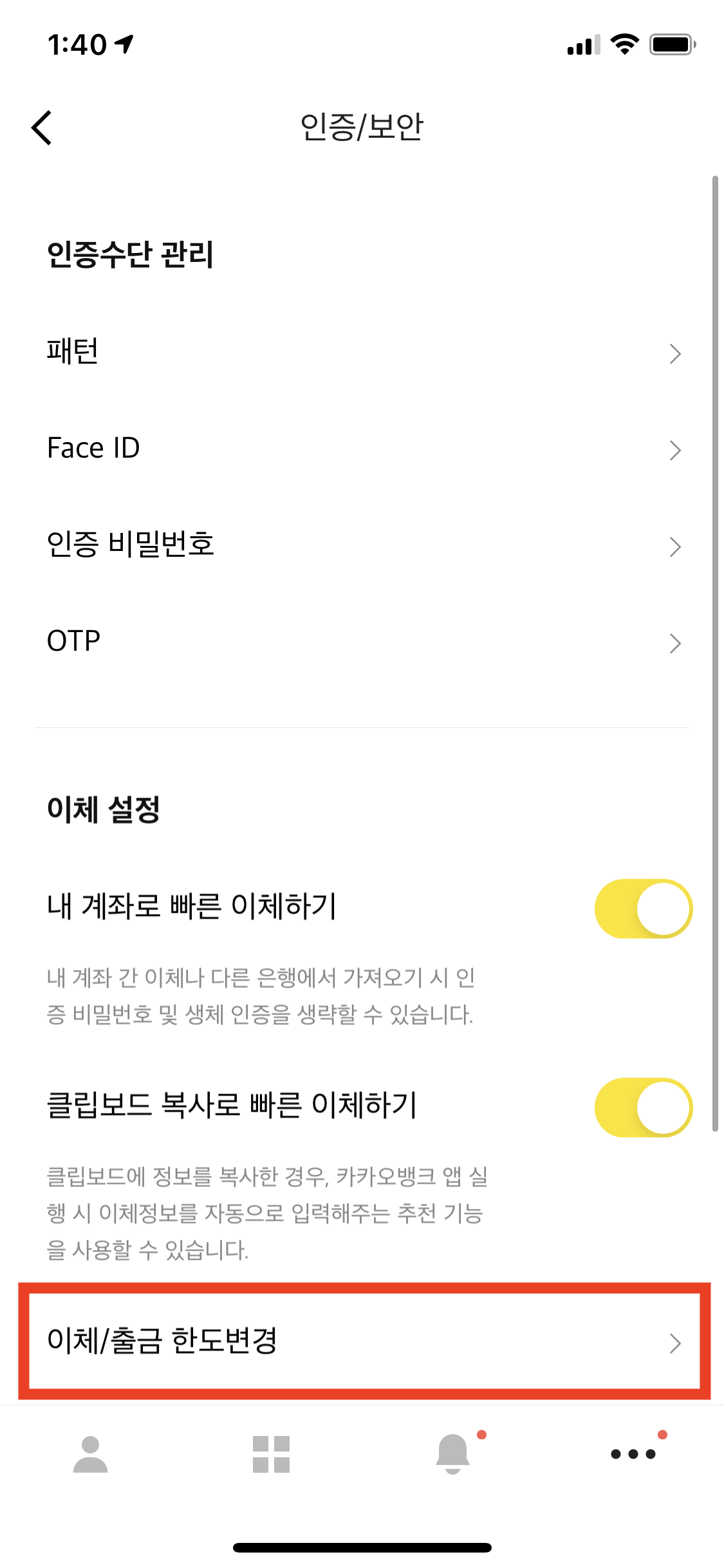 먼저 카카오뱅크 앱을 실행하고 첫 화면 우측 하단의 더보기 아이콘을 선택한다. 아이콘 선택 후에 '인증/보안 > 이체/출금 한도변경' 메뉴를 차례로 선택하면 된다.