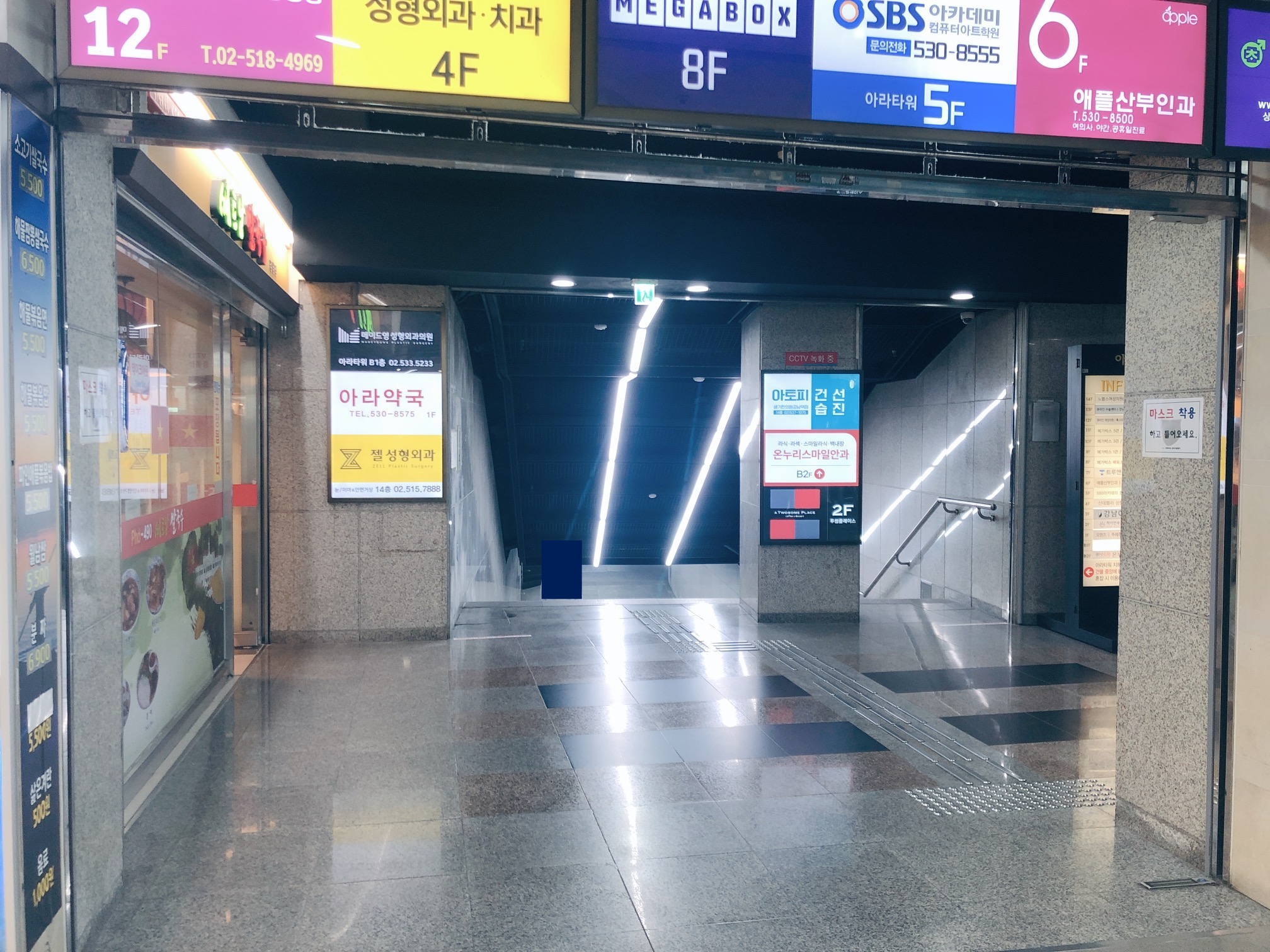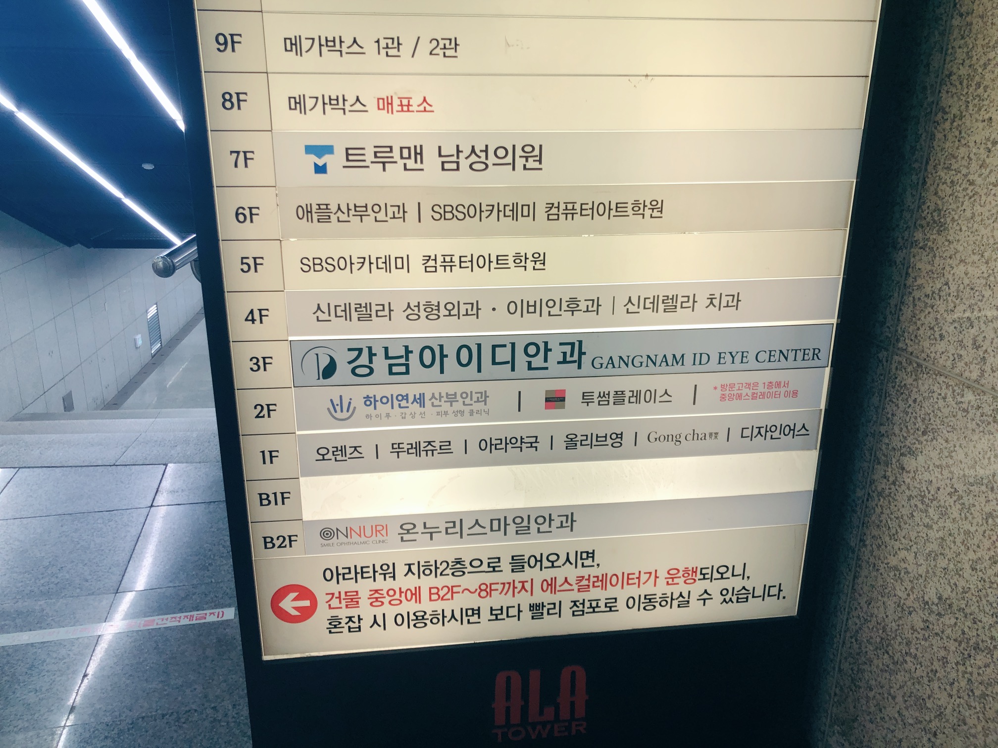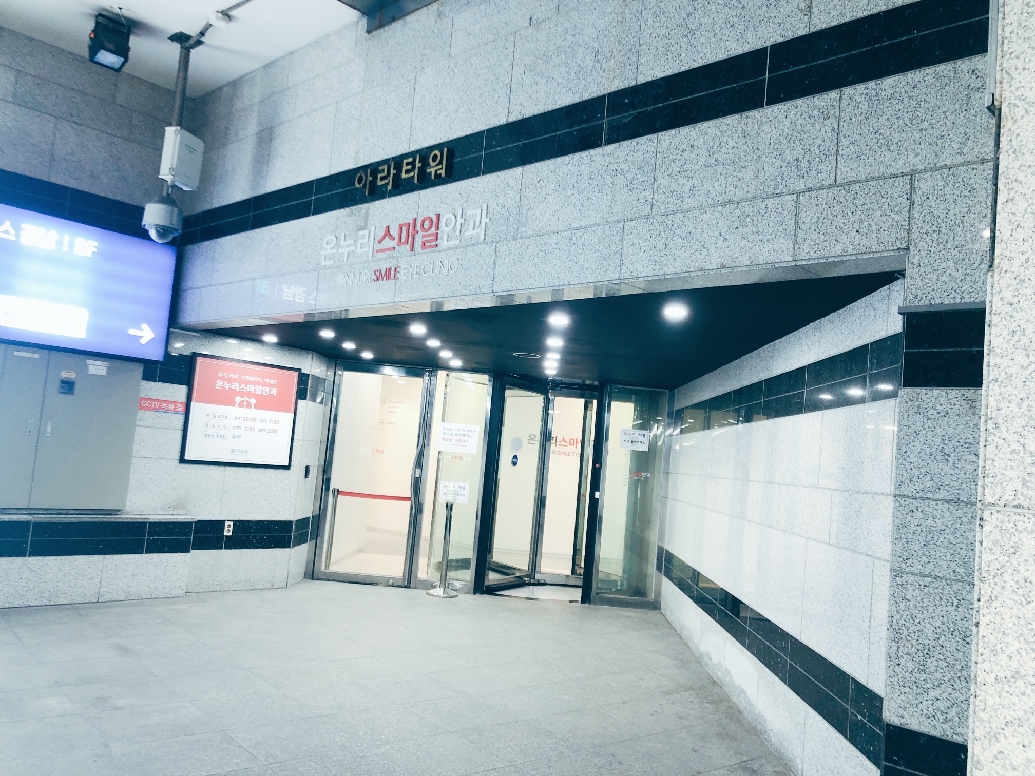 온누리스마일안과는 강남역 지하상가와 연결되어 있다. 지하철을 이용하여 강남역까지 왔다면 지상으로 나올 필요가 없다. 강남역 9번 출구 방면에서 출구로 나가지 말고! 왼편에 보면 아라타워 입구를 발견할 수 있을 것이다. 온누리스마일안과는 지하 2층이라서 지하도를 따라 내려가기만 하면 바로 입구에 도착한다.