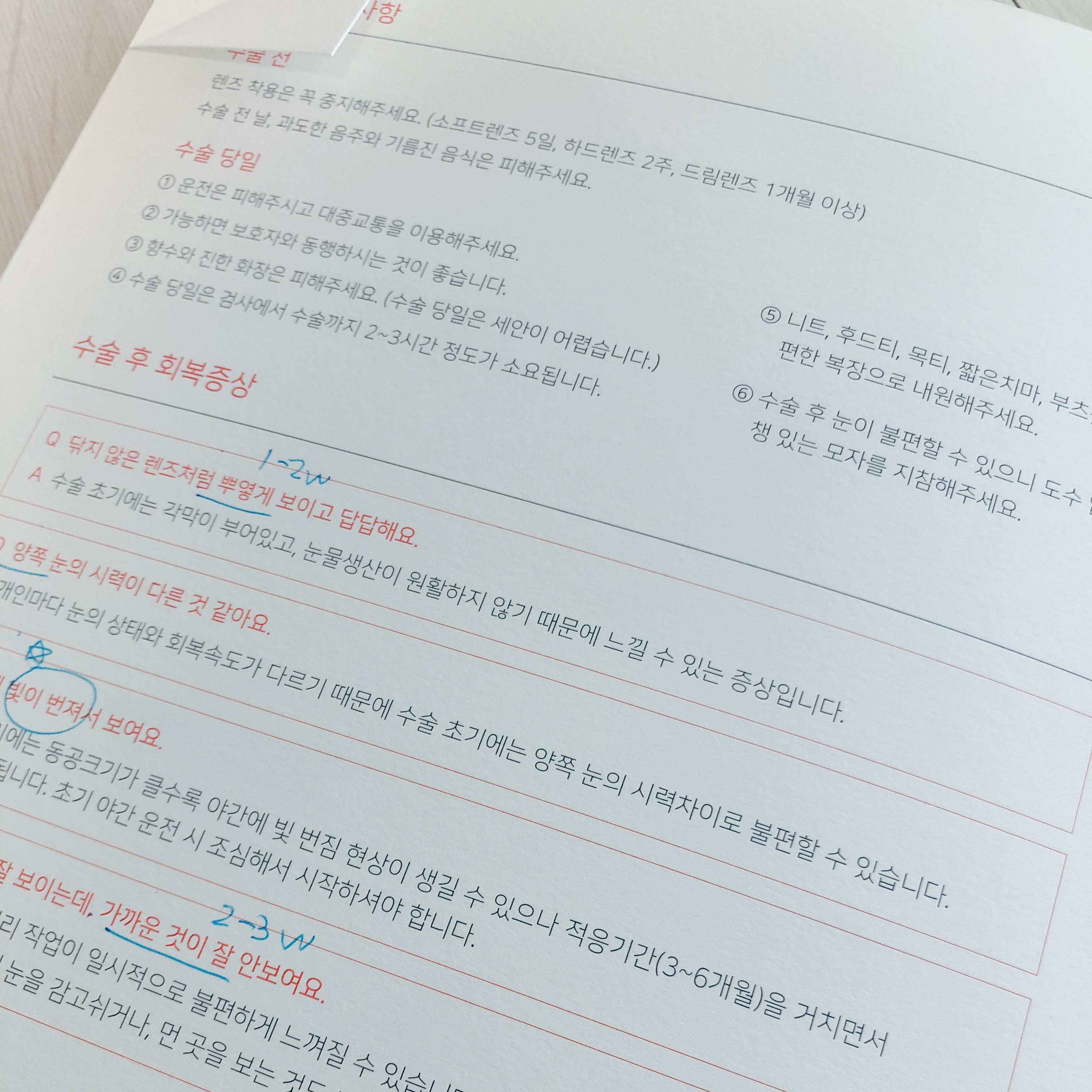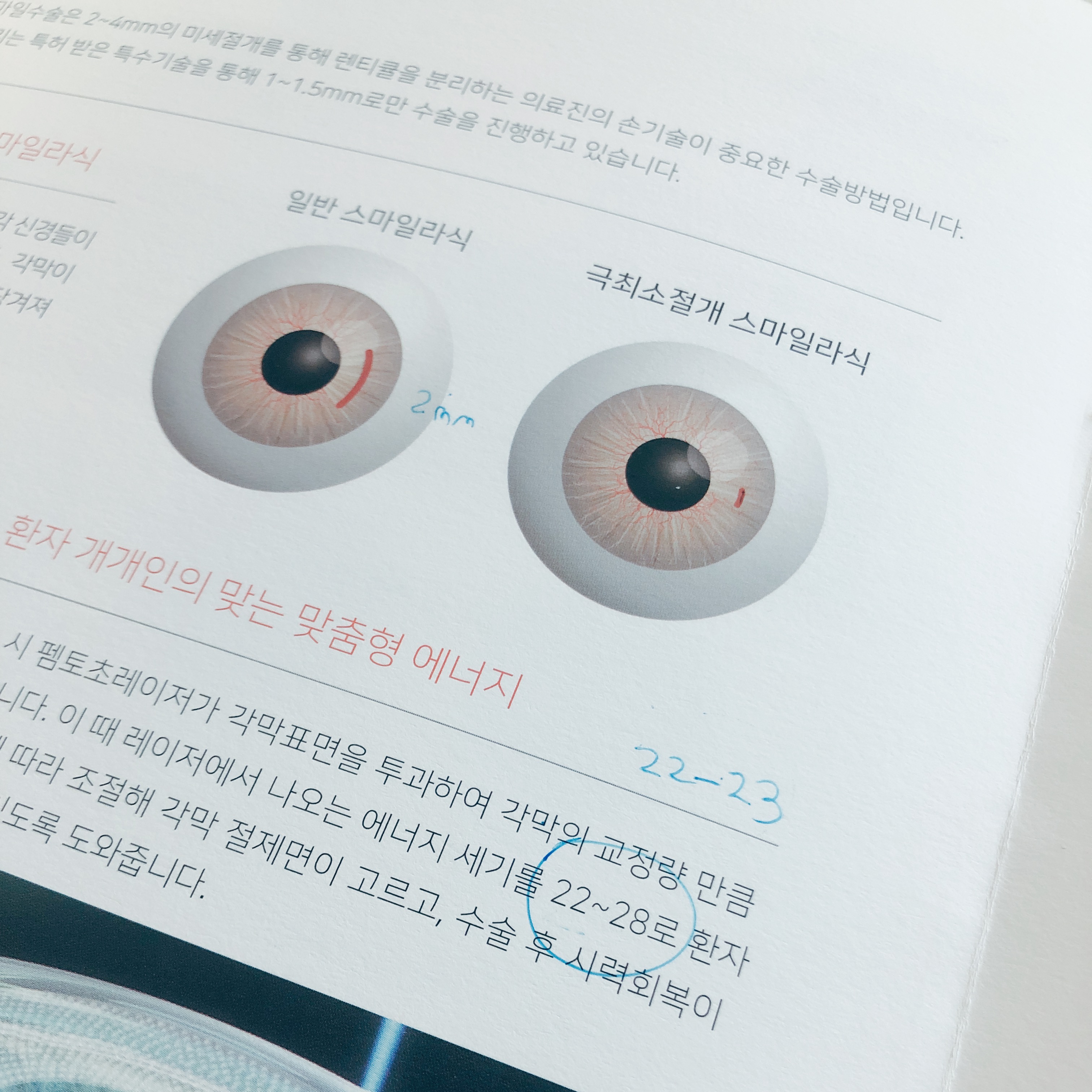 검안사 선생님과의 검사가 끝나고 나면 원장님과의 진료, 상담을 통해서 나에게 가장 적합한 수술을 결정하게 된다. 나는 온누리스마일안과의 김부기 원장님께 진료를 받았다. 검사 후에 검사 결과가 정리된 얇은 책(?)을 받을 수 있는데, 책 안에 각 시술방법과 주의사항들도 함께 안내되어 있다.