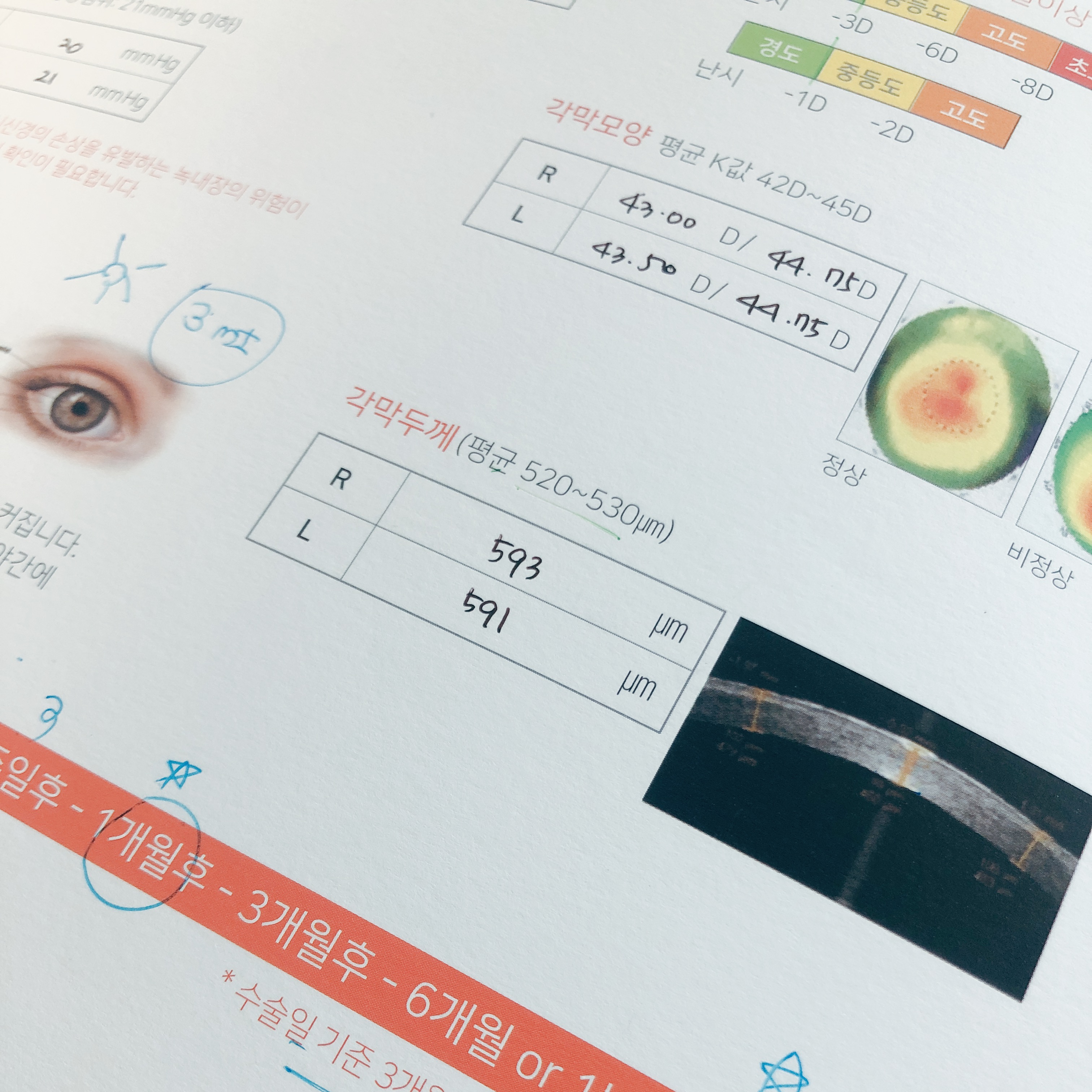 가능하면 꼭 오늘 수술을 하고 싶었는데... 결과적으로 나는 당일 수술은 실패했다 OTL 수술을 진행하지 못한 이유는 '각막 상처' 때문이었다. 검사 결과 안압, 동공크기, 각막두께, 각막내피세포, 황반부 CT검사, 망막안저촬영, 시신경유두검사, 시신경검사, 시야검사 모두 정상이어서 스마일라식은 가능한 눈이라는 답변을 받았다. 다만, 눈물 분비량이 적어서 건조한 편이라 이 부분은 신경을 써주어야 한다고 한다.