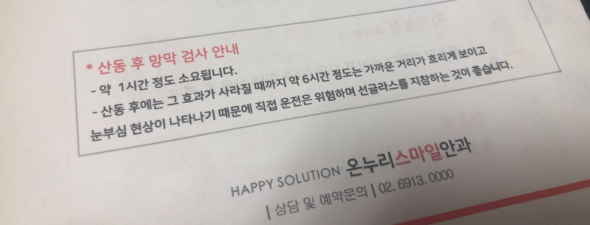 여기까지 딱 좋았는데 다음으로 이어진 산동검사... 산동검사는 눈의 내부 구조 이상을 검사하기 위해 부교감신경 차단제 성분인 산동제를 넣어서 동공괄약근을 마비시키고, 동공을 확장시켜 동공 뒤에 있는 안구 내부구조를 살펴보는 검사이다. 산동검사는 약 1시간 정도 소요되며, 산동 후에는 그 효과가 사라질때까지 약 6시간 정도는 가까운 거리가 흐리게 보이고 눈부심 현상이 나타난다. 때문에 직접 운전은 위험하며, 선글라스를 지참하는 것이 좋다는 문구가... 안내문 뒤에 쓰여 있었는데, 나는 그게 다음날 하는 검사인 줄 몰랐다는 게 함정-_-;