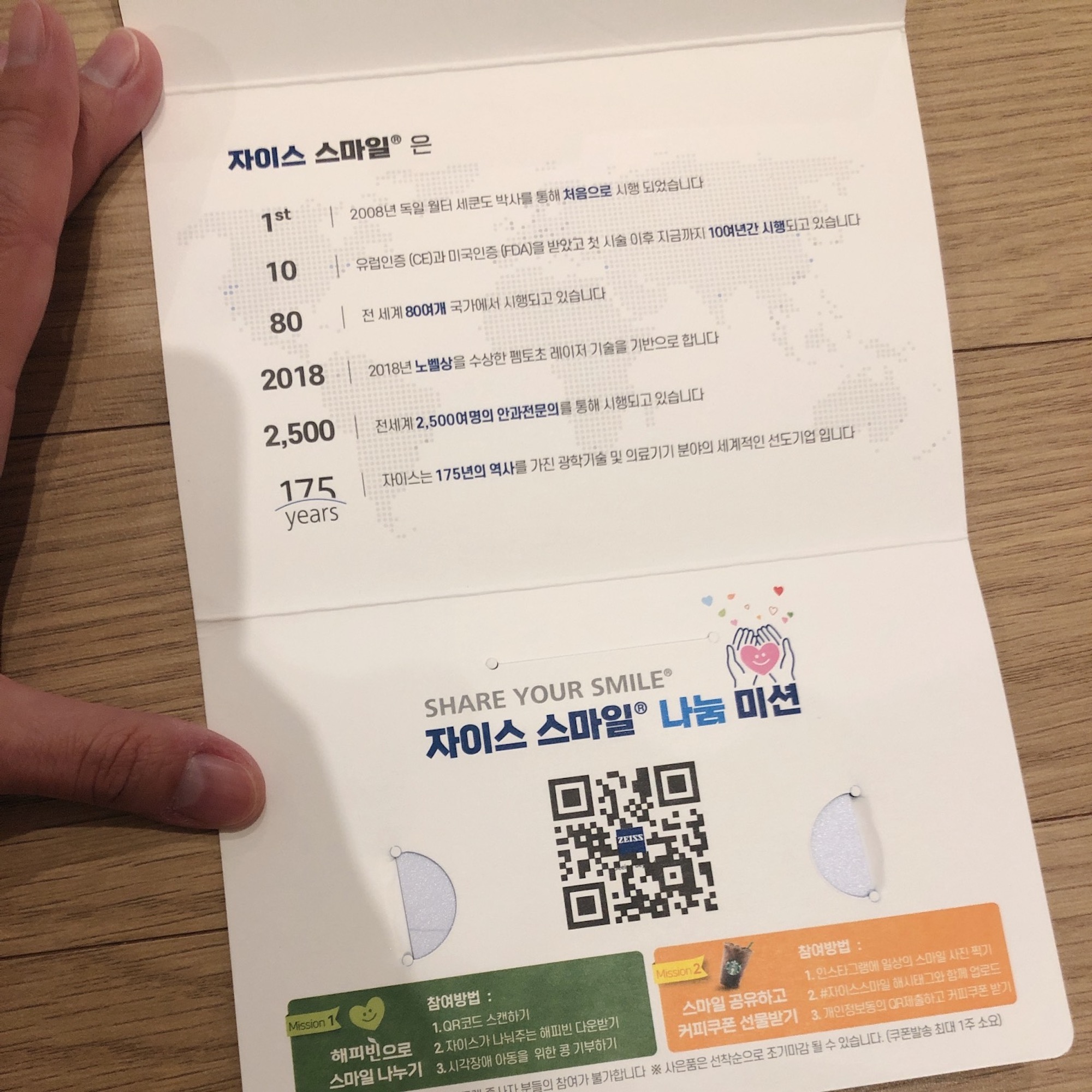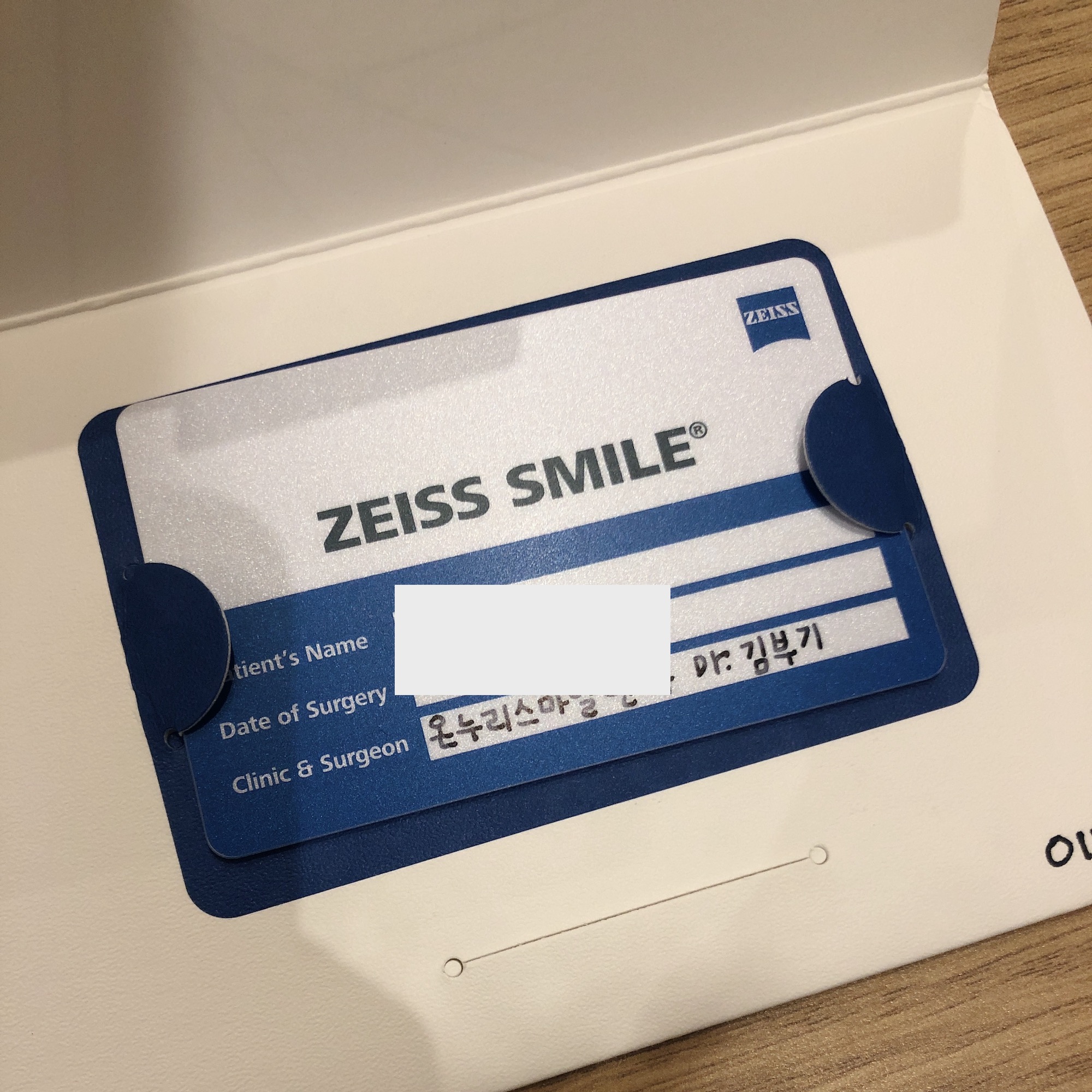 병원에 도착해서 가장 먼저 시력검사를 진행했다. 시력은 오른쪽 눈은 1.2 왼쪽 눈은 1.0 함께 보면 1.5 라고 검안사님께서 말씀하셨다. 물론 지금 시력이 확정되는 것은 아니고, 눈이 완전히 회복되고 나면 어떻게 관리하느냐에 따라 더 좋아질수도, 더 나빠질수도 있다고 한다. 몇가지 촬영을 진행한 후에 자이스 스마일 카드와 진료카드를 받았다. 자이스 스마일 카드에는 이름, 수술일, 안과명과 담당 선생님 성함이 적혀 있었다. 그리고 진료카드 뒷면에는 이름, 생년월일, 주치의, 수술일, 수술방법과 함께 근시, 난시, 난시축, 각막두께, 에너지, 최소절개 등 개인적인 수술 정보들이 기재되어 있었다. 나는 양쪽 모두 1.0mm 절개를 했다고 한다.