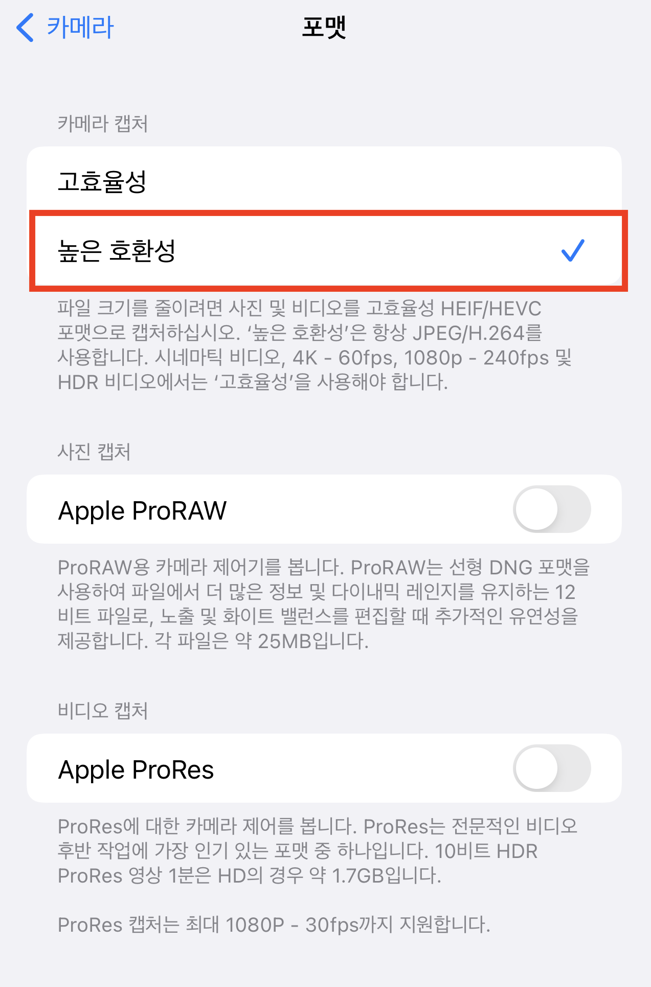 포맷을 선택하여 카메라 캡처 > 기존 고효율성으로 되어있던 것을 높은 호환성으로 변경해주면 된다.