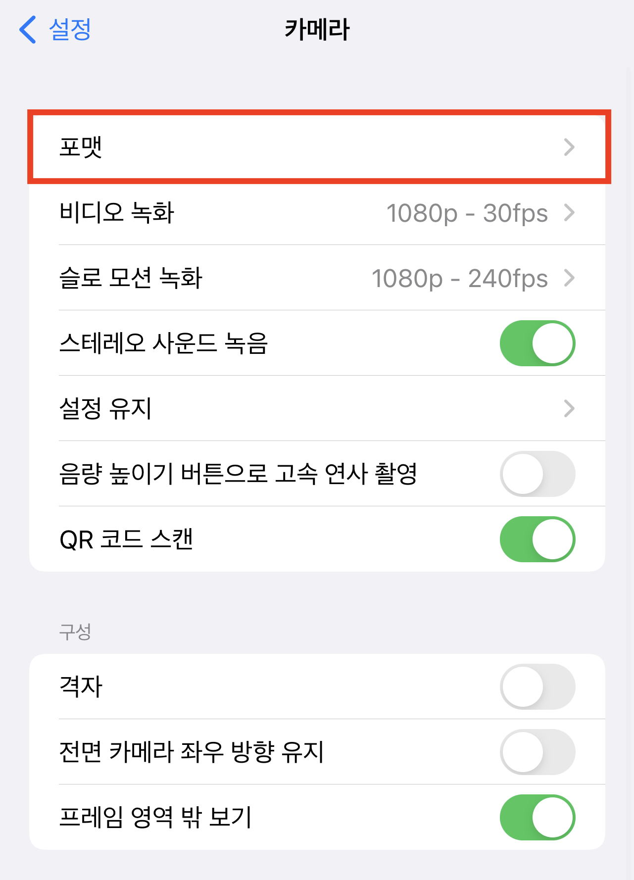 - 아이폰 카메라 설정을 변경해서 촬영 결과물을 jpg 파일로 저장하기