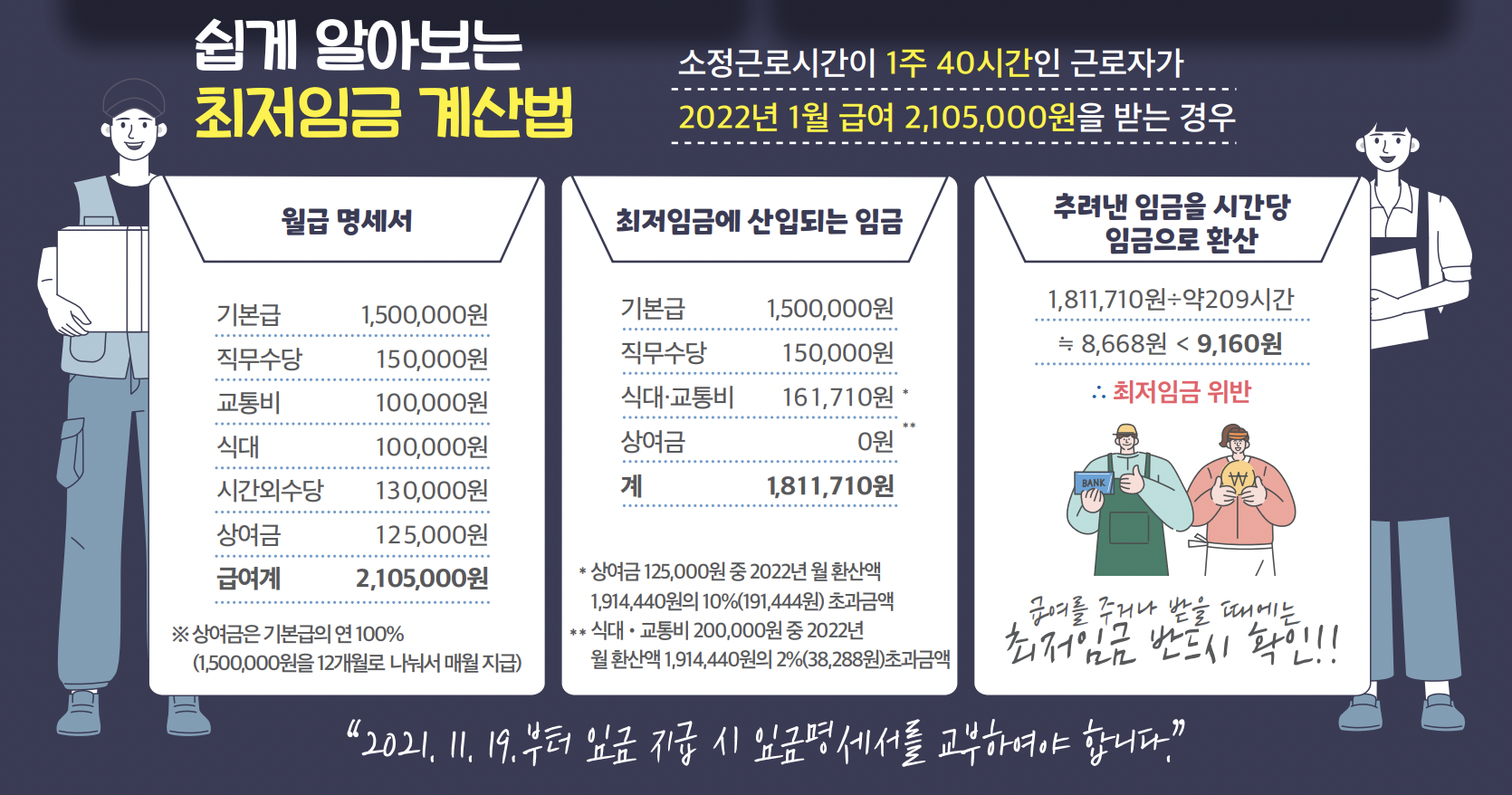 근로기준법상 임금으로서 매월 1회 이상 정기적으로 지급되는 임금에서 최저임금에 산입하지 않는 임금을 제외하고, 이를 시간당 임금으로 환산한 후에 시간급 최저임금액과 비교해보면 된다. 아래 이미지를 참고하면 도움이 될 듯 하다.