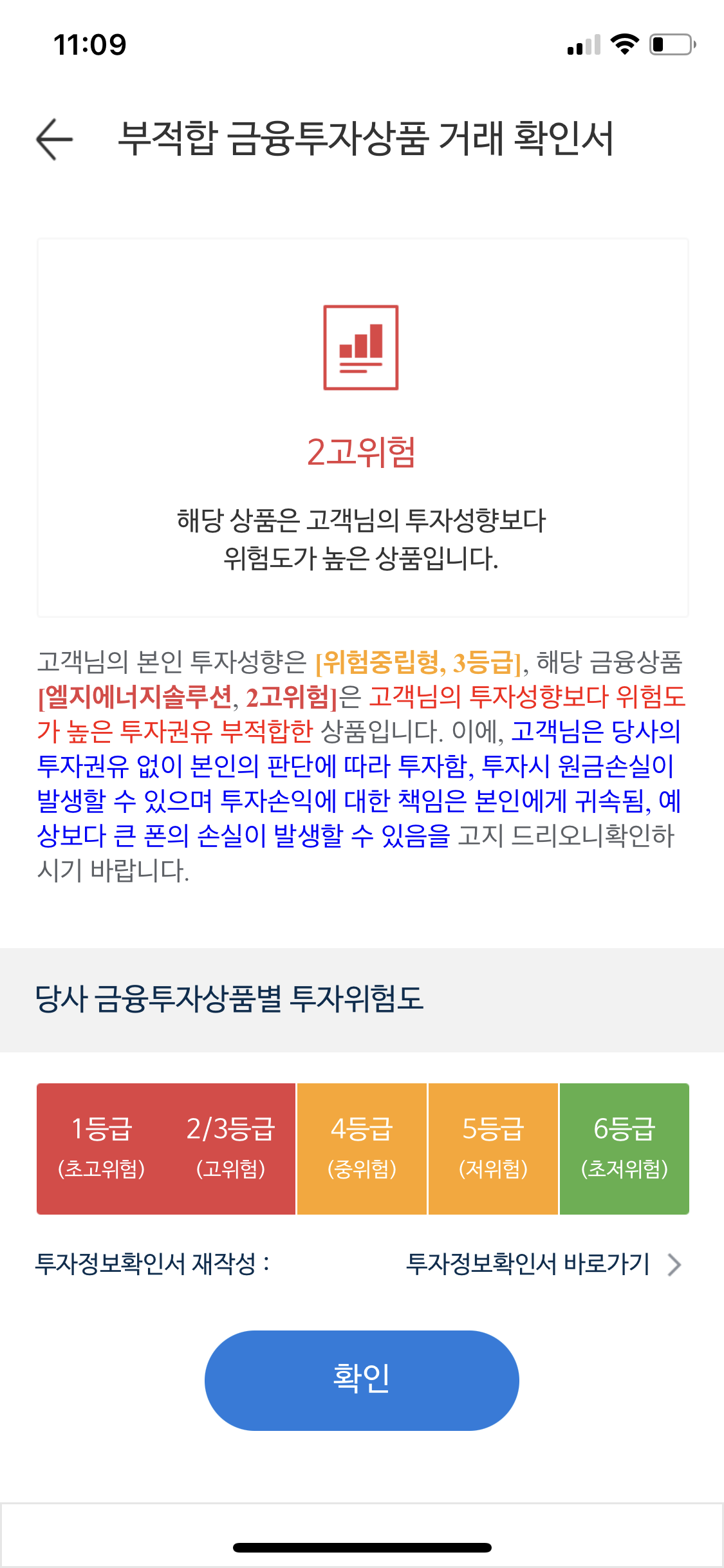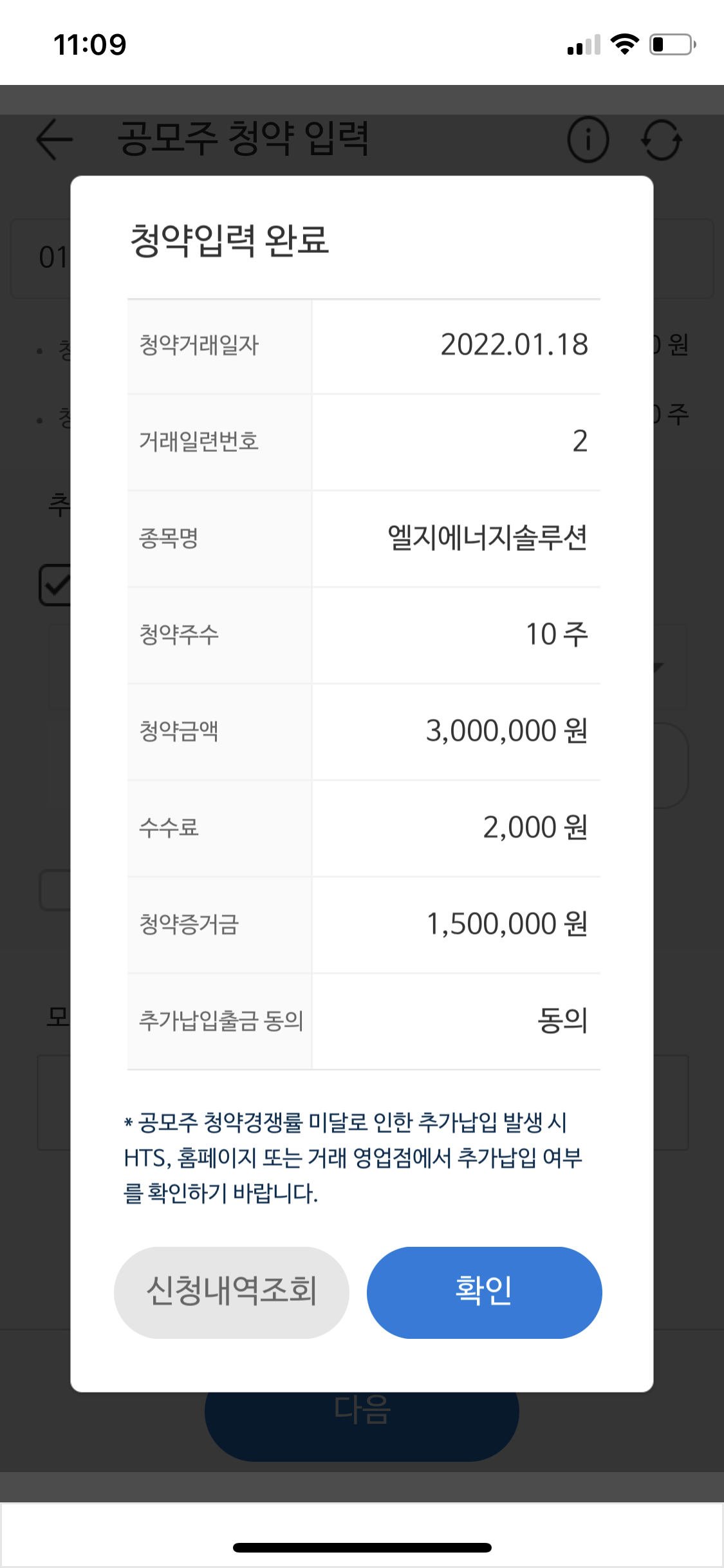 이 상품은 나의 투자성향보다 위험도가 높은 상품이라고 한다. 이런것도 알려주다니 친절한 미래에셋증권...ㅋㅋ 확인을 누르면 청약입력이 완료되었다는 안내창이 뜬다.
