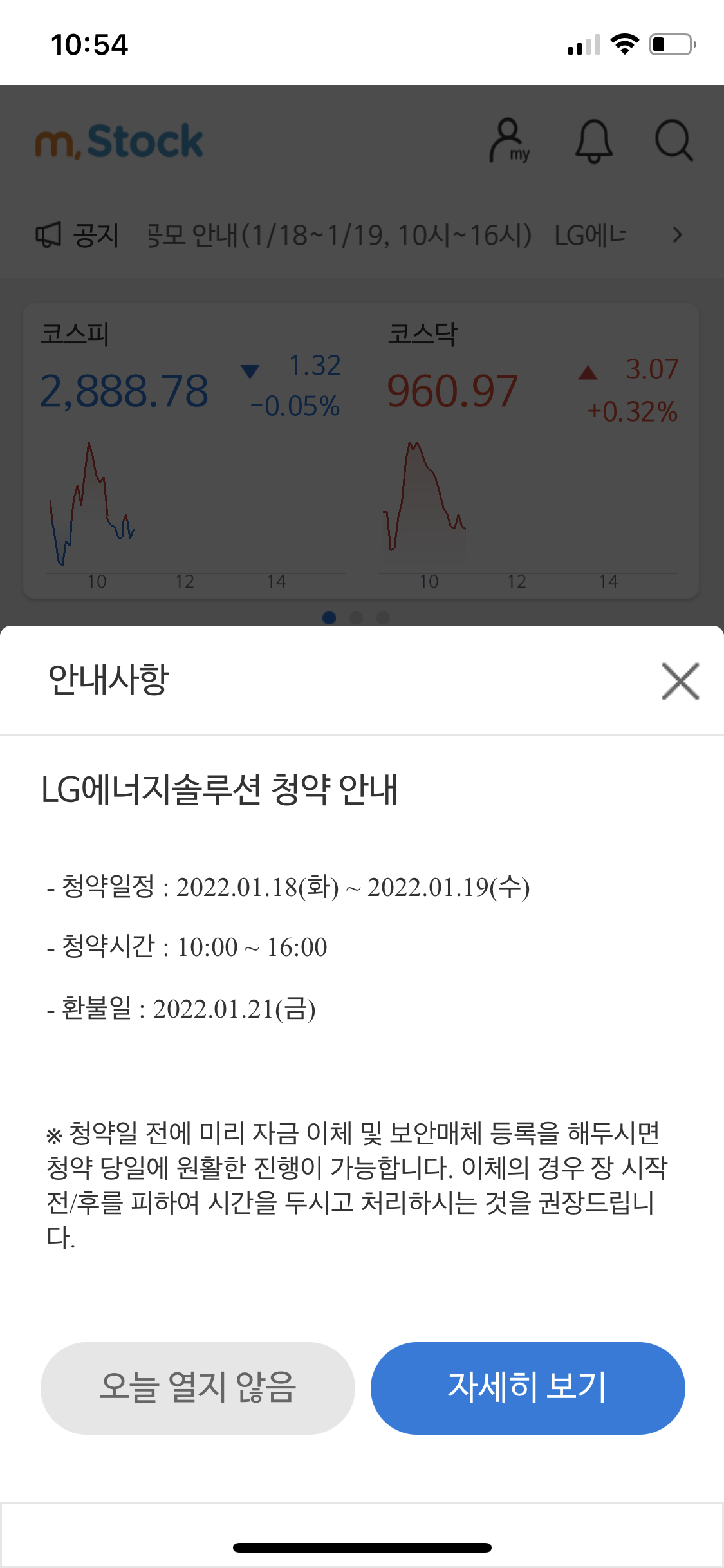 미래에셋증권 m.Stock을 실행한다. 실행하자마자 LG에너지솔루션 청약안내 팝업이 뜬다. 자세히 보기를 누르면 공지사항으로 이동하는데 닫기 버튼을 이용하여 창을 닫고, 좌측 하단의 메뉴 아이콘을 선택한다.