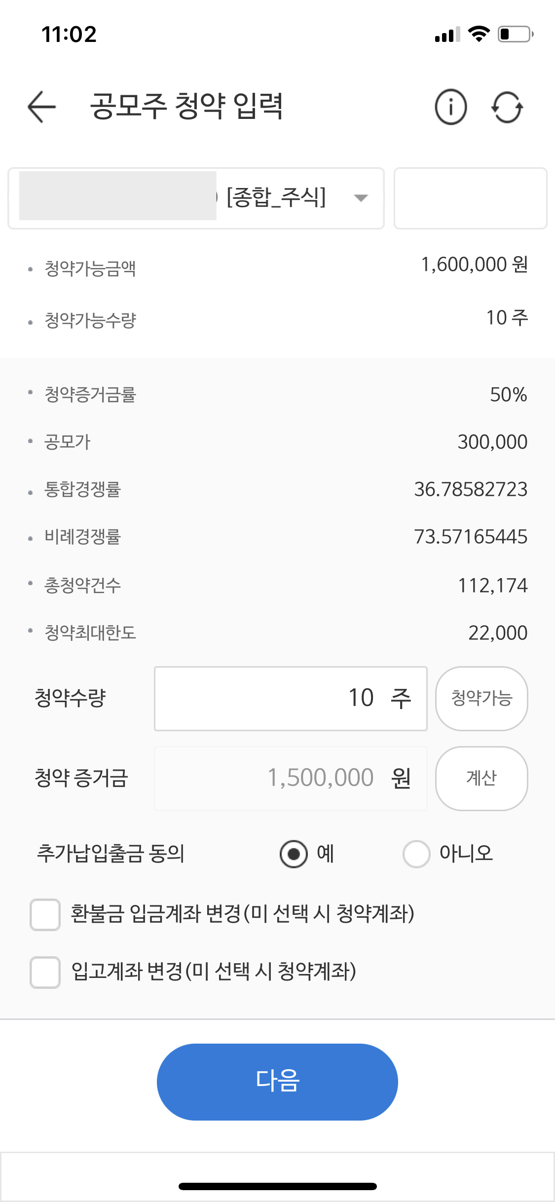정보 확인 후에 하단의 청약입력 버튼을 누른다. 청약수량을 설정하고 계산 버튼을 누르면 자동으로 증거금이 표시된다. 환불금 입금계좌도 변경이 가능하다. 나는 주거래은행인 우리은행으로 환불계좌정보를 수정했다. 캡처화면에서는 표시되지 않지만 아래에 모바일 OTP 핀번호까지 입력하고 나서 다음 버튼을 누른다.