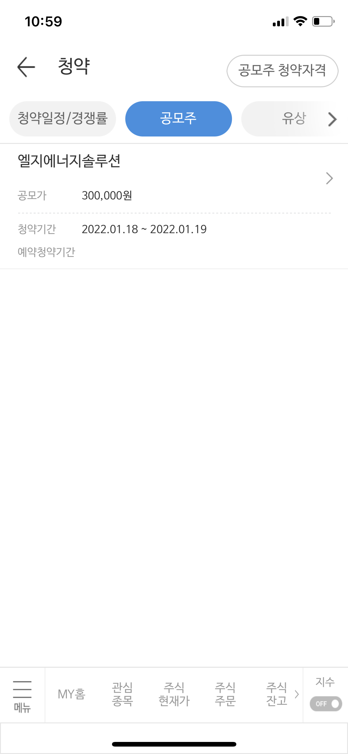 메뉴를 드래그하여 아래로 내리다보면 '뱅킹/자산 > 권리/청약 > 공모주 청약' 카테고리가 있다. 공모주 청약 페이지로 이동하면 현재 청약 가능한 공모주 리스트가 보인다. 현재에는 엘지에너지솔루션 하나만 확인이 가능하다. 해당 공모주를 선택한다. 공모주 청약 상세 페이지에서 LG 에너지솔루션의 청약상세 정보와 청약증거금 정보를 확인할 수 있다.