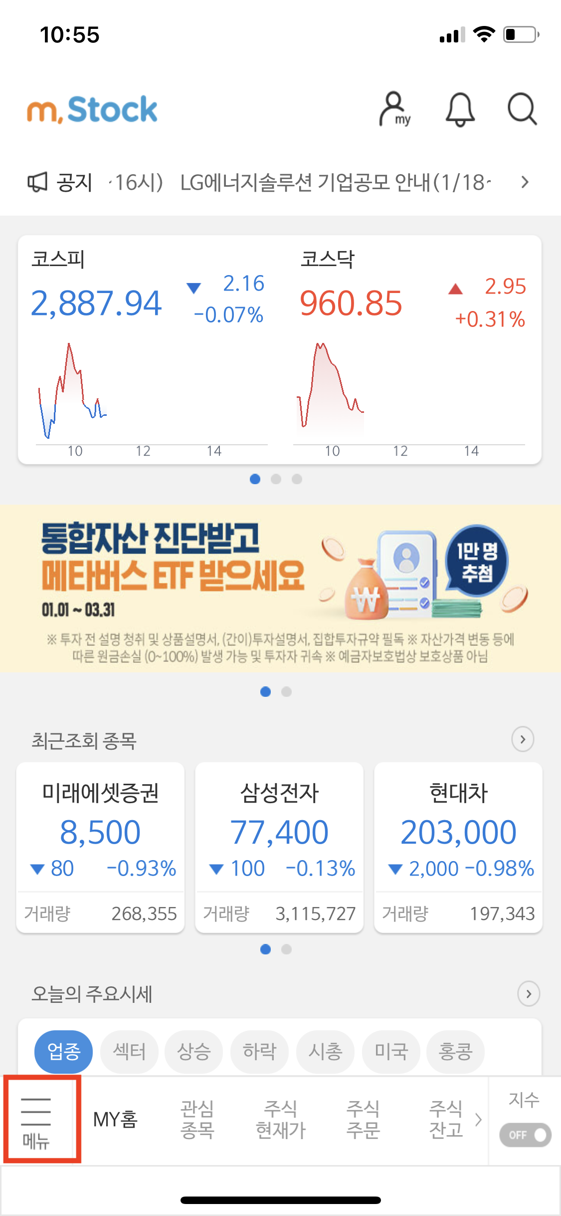 미래에셋증권 m.Stock을 실행한다. 실행하자마자 LG에너지솔루션 청약안내 팝업이 뜬다. 자세히 보기를 누르면 공지사항으로 이동하는데 닫기 버튼을 이용하여 창을 닫고, 좌측 하단의 메뉴 아이콘을 선택한다.