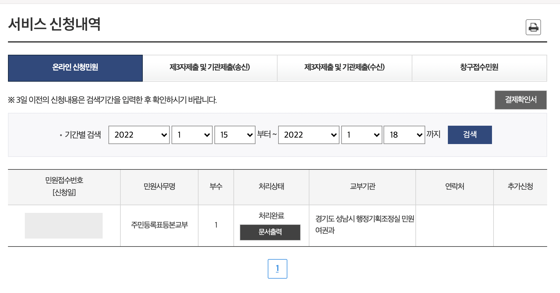 하단에 있는 민원 신청 버튼을 누른다. 버튼을 누르면 서비스 신청내역 페이지로 이동하며, 신청한 주민등록표등본을 리스트에서 확인할 수 있다.