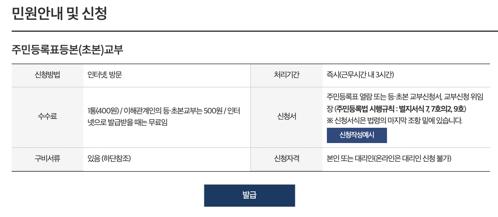 민원안내 및 신청 페이지에서 발급 버튼을 클릭한다.
